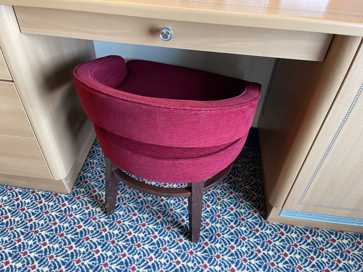 There’s a short red velvet chair at the desk.