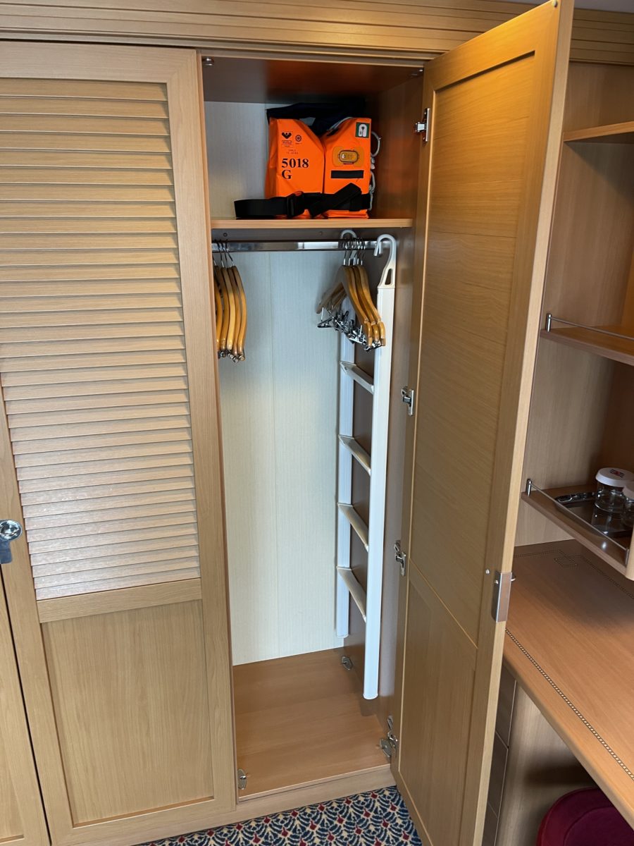 The ladder for reaching the ceiling bed is in the second closet. Cast Members take care of opening the bed and setting up the ladder each night.