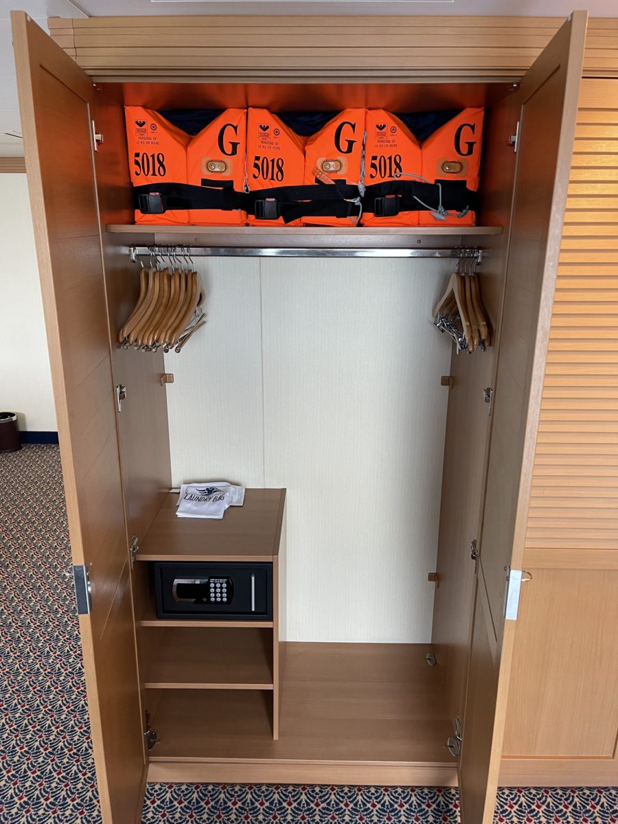 There are life vests in the closets of every room. The safe is on a shelf in the larger closet.