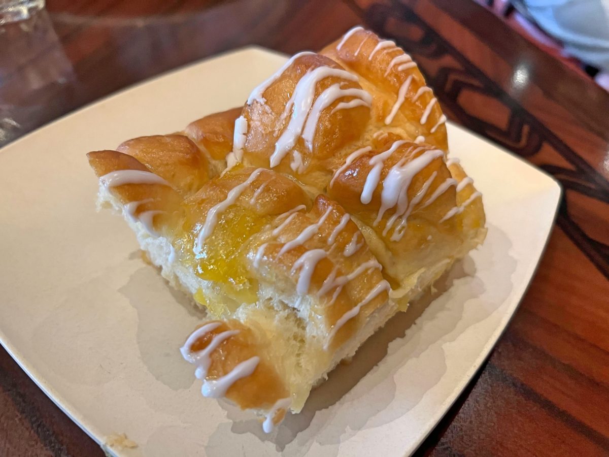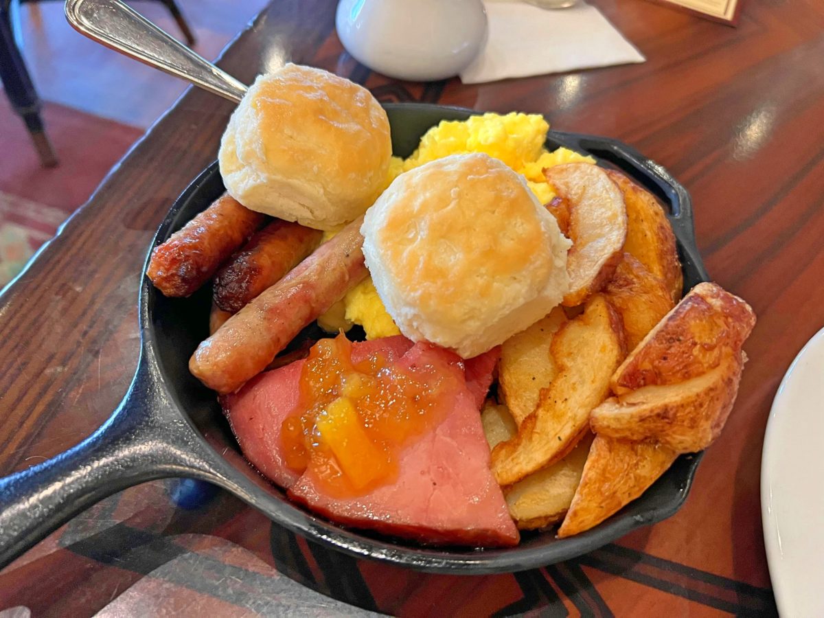 Freshly made Pineapple-Coconut Breakfast Bread is also served. Guests who order the plant-based skillet receive a cinnamon-sugar donut.