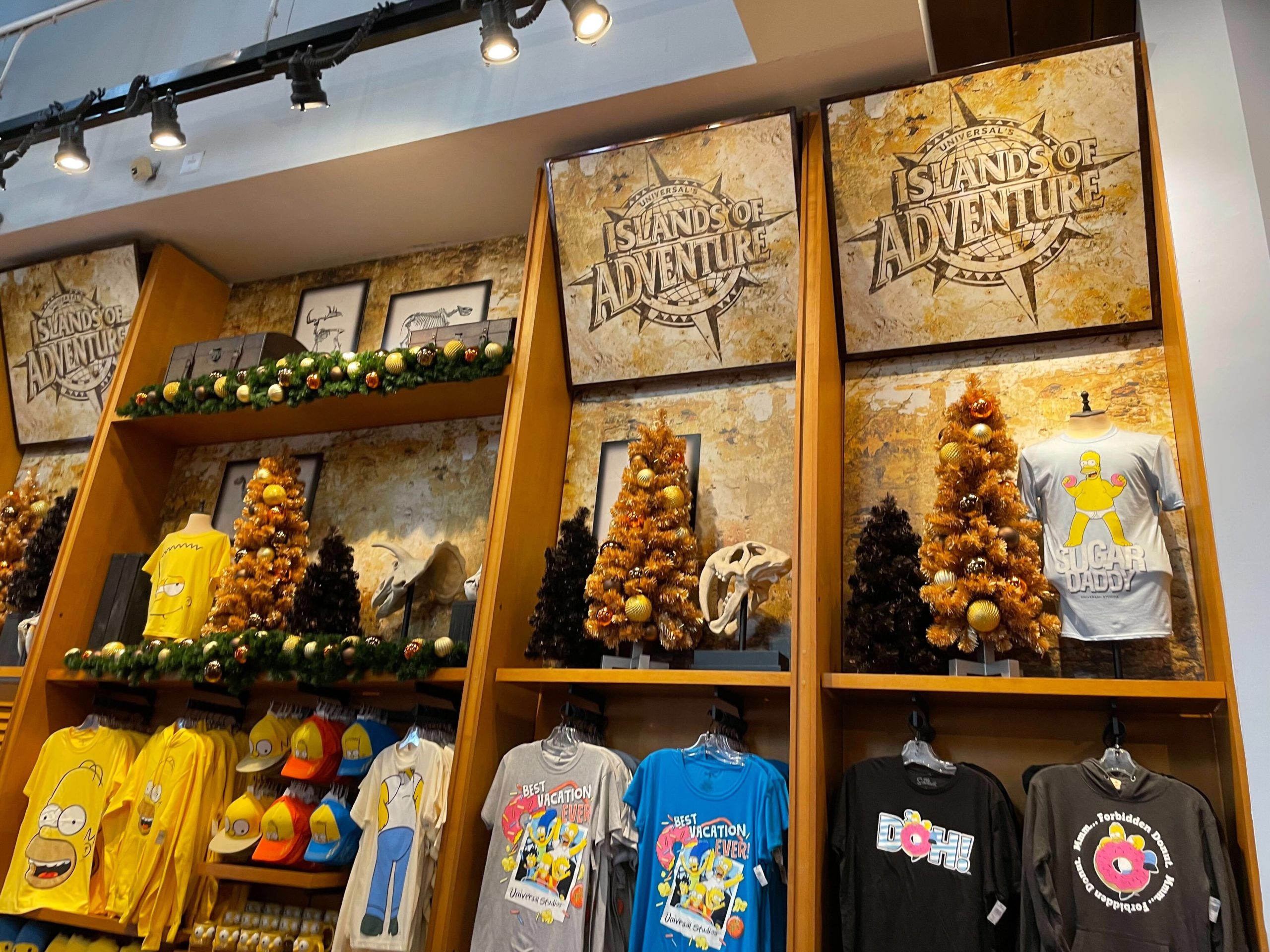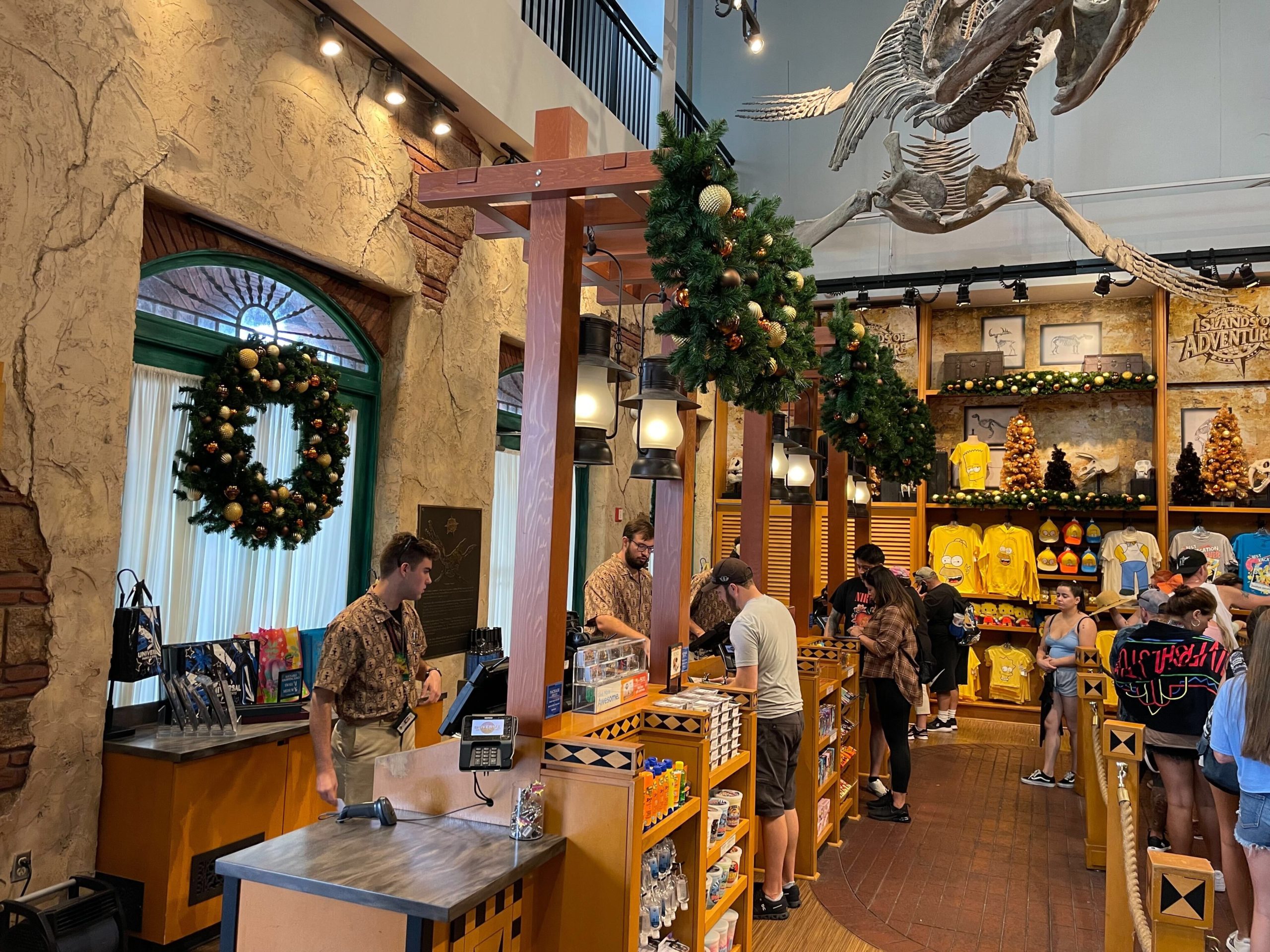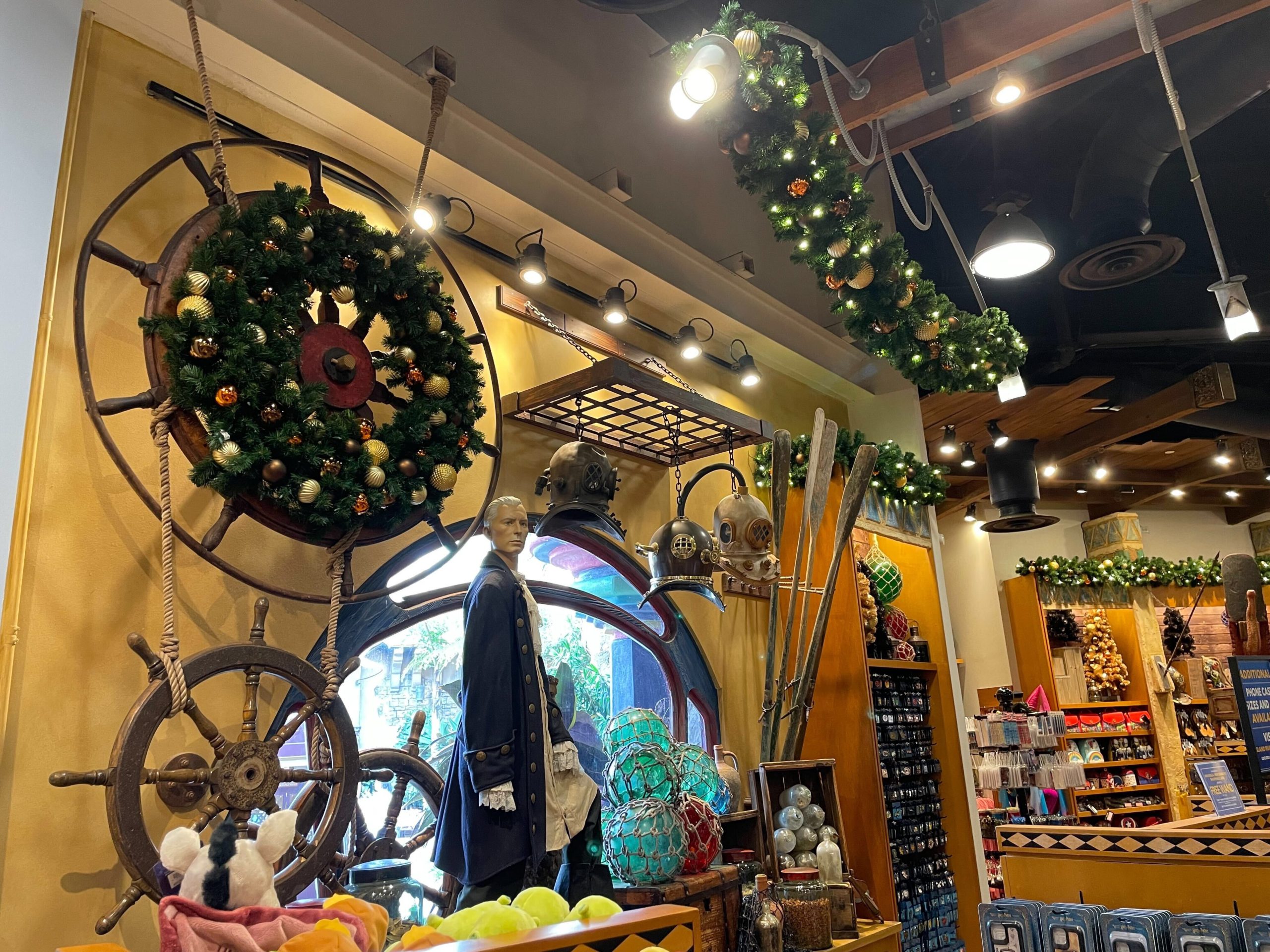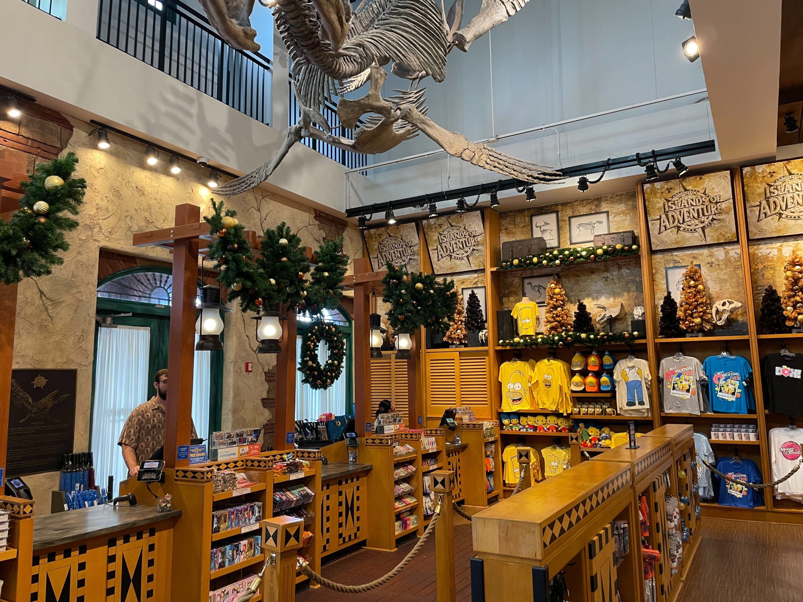 Inside the Islands of Adventure Trading Company, holiday decor spreads throughout the entire shop, except for The Wizarding World section.