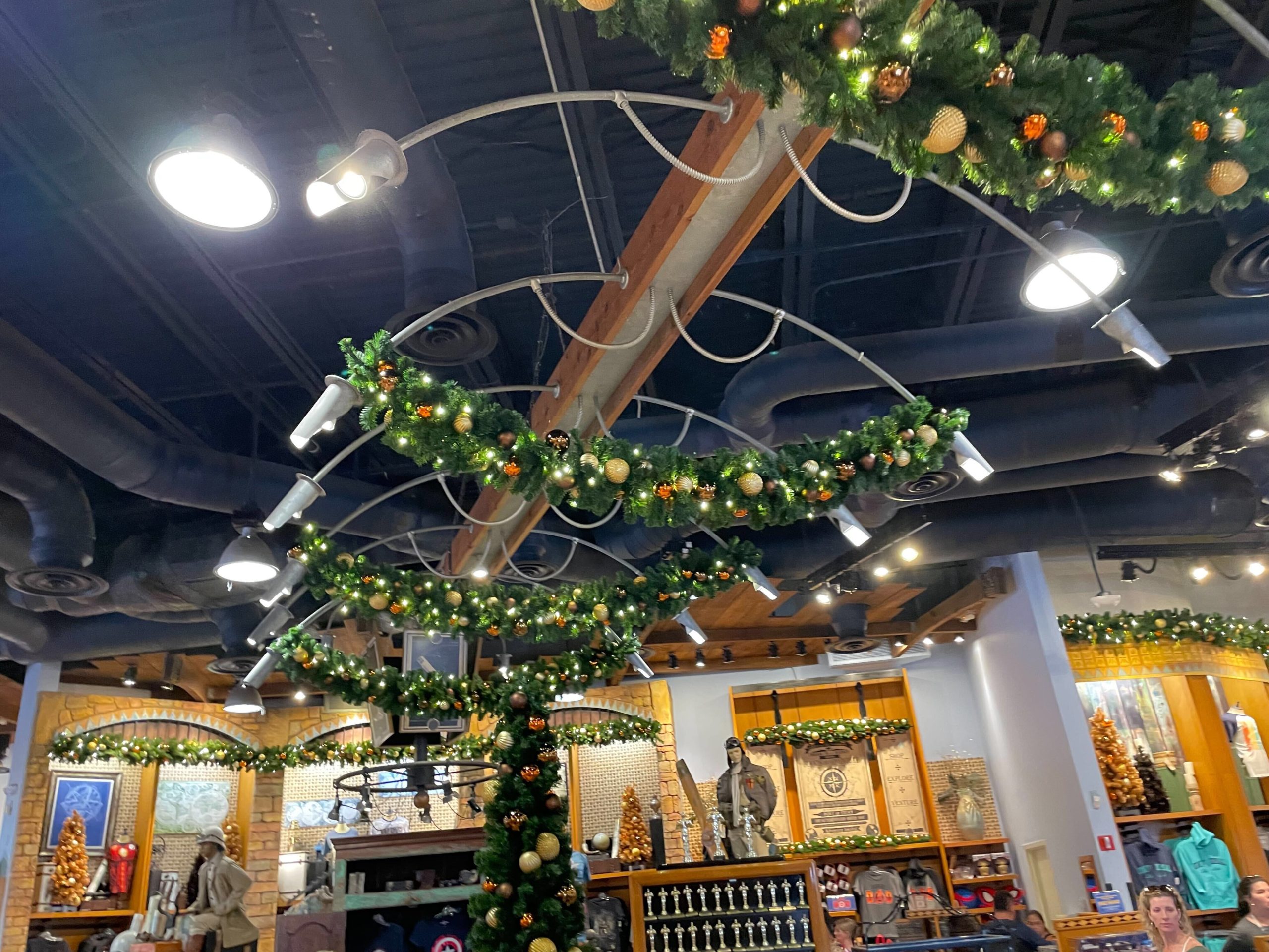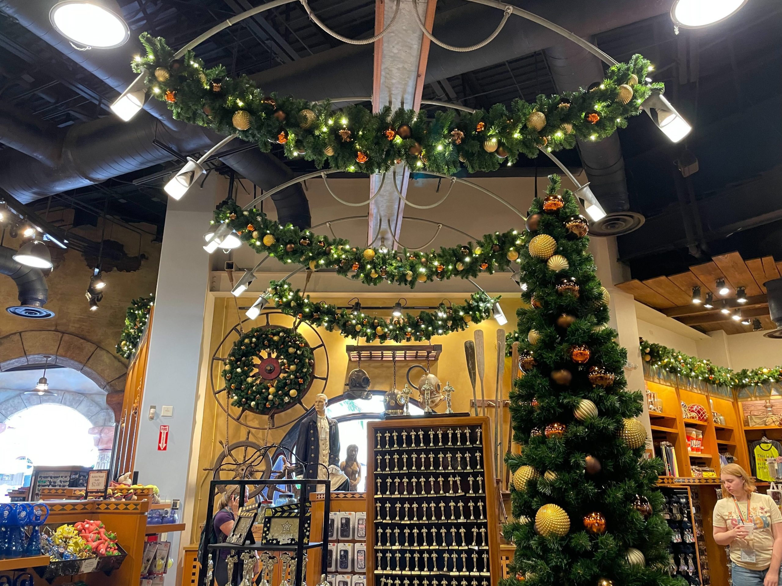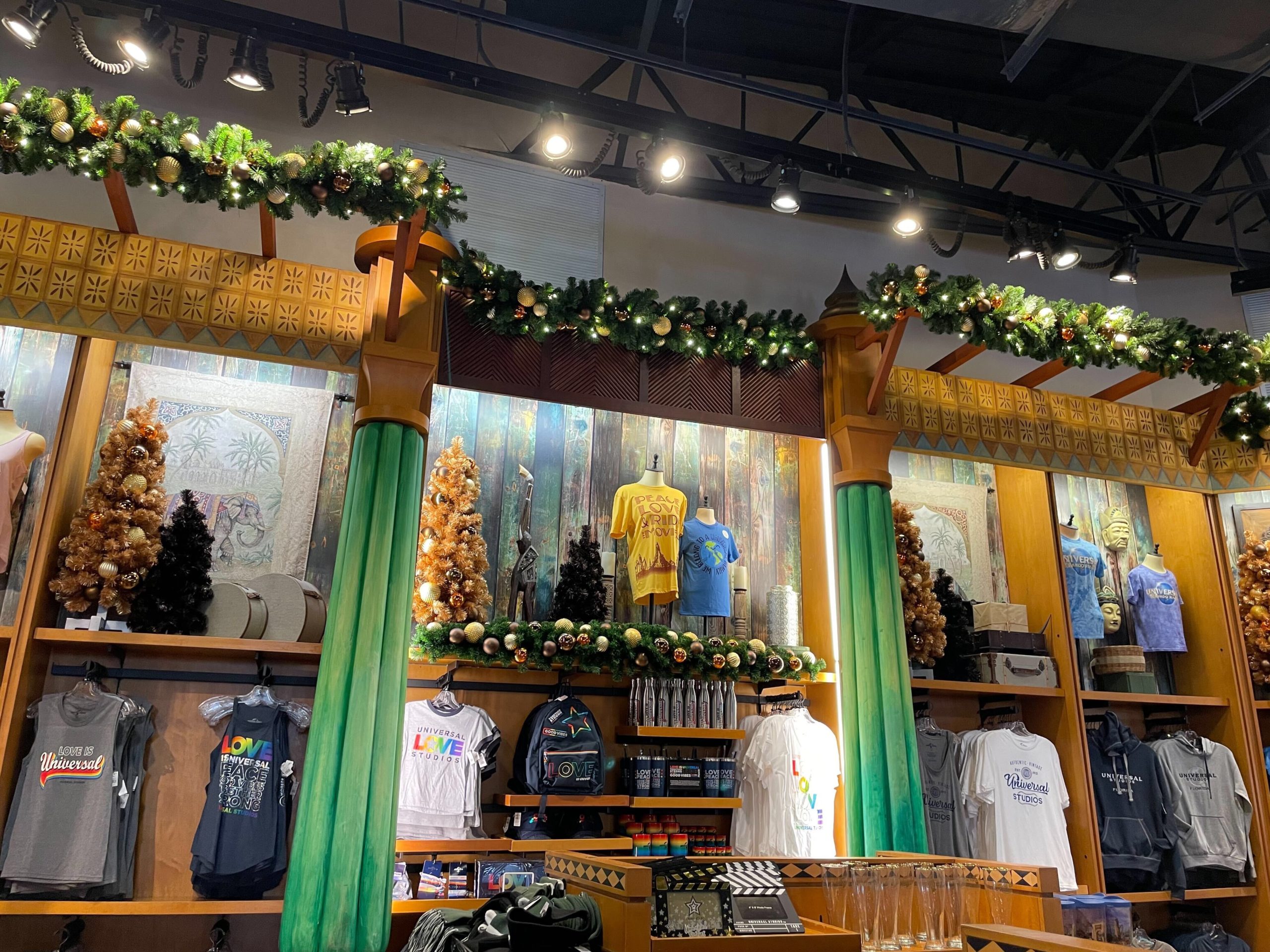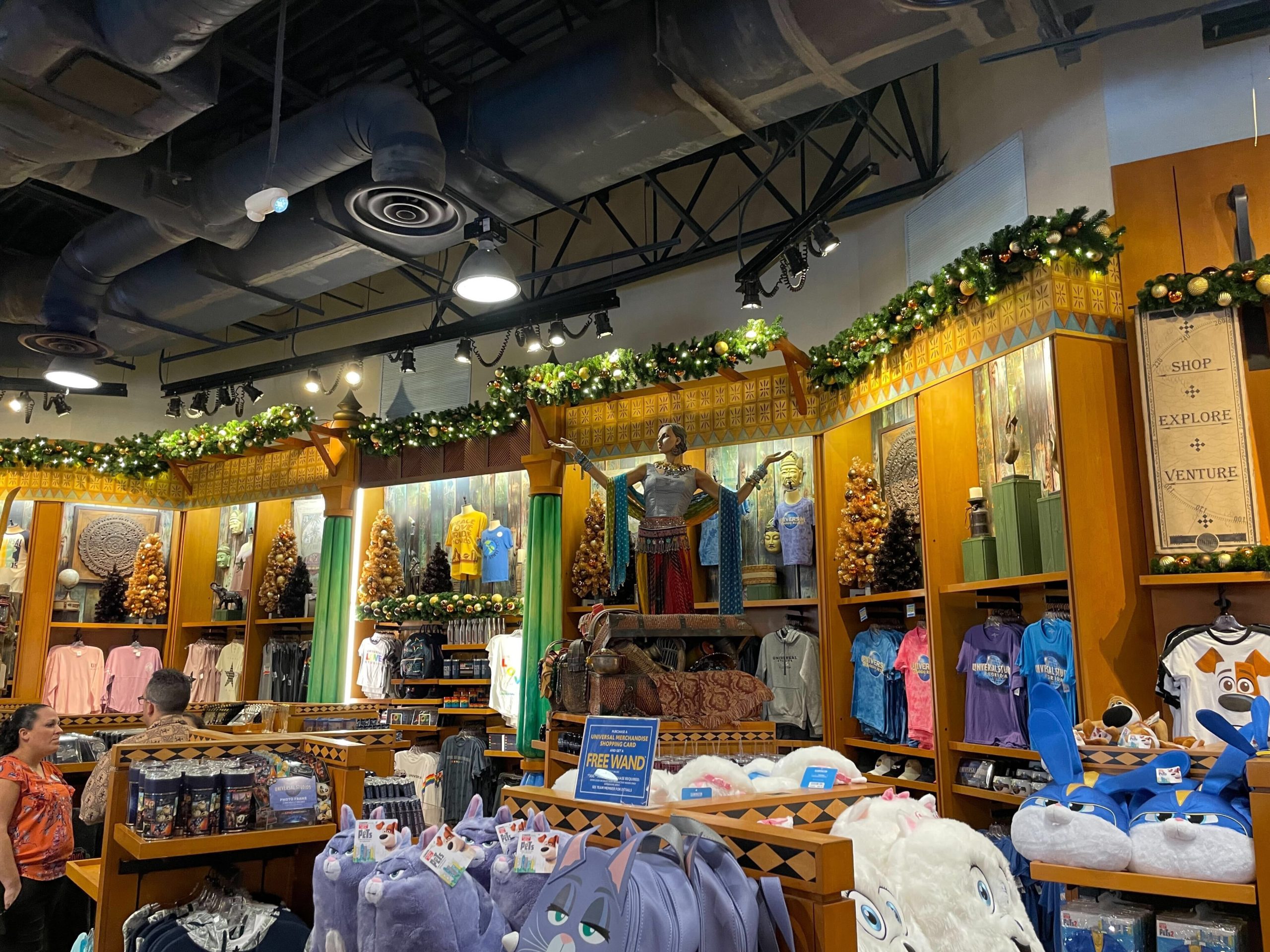 Inside the Islands of Adventure Trading Company, holiday decor spreads throughout the entire shop, except for The Wizarding World section.