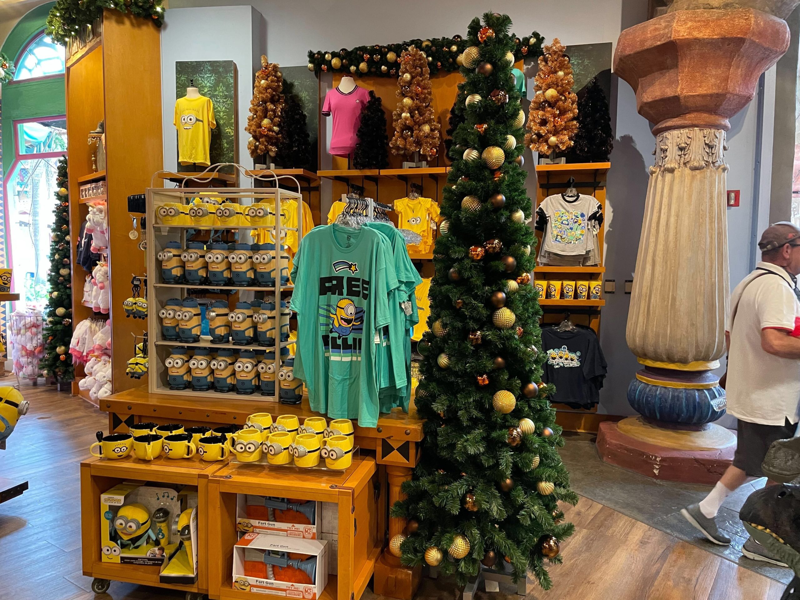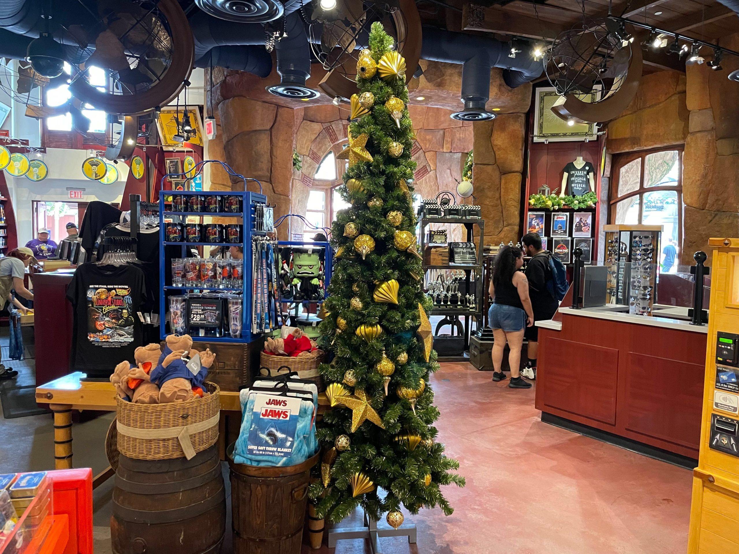 Large Christmas trees have been erected next to some merchandise stands.