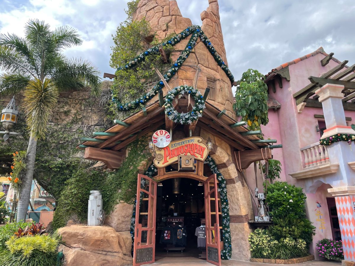 A large wreath with blue and gold ornaments hangs above the Defotos Expedition Photography store. A few pieces of garland with the same color ornaments and stars wrap the tower and line the doorway.