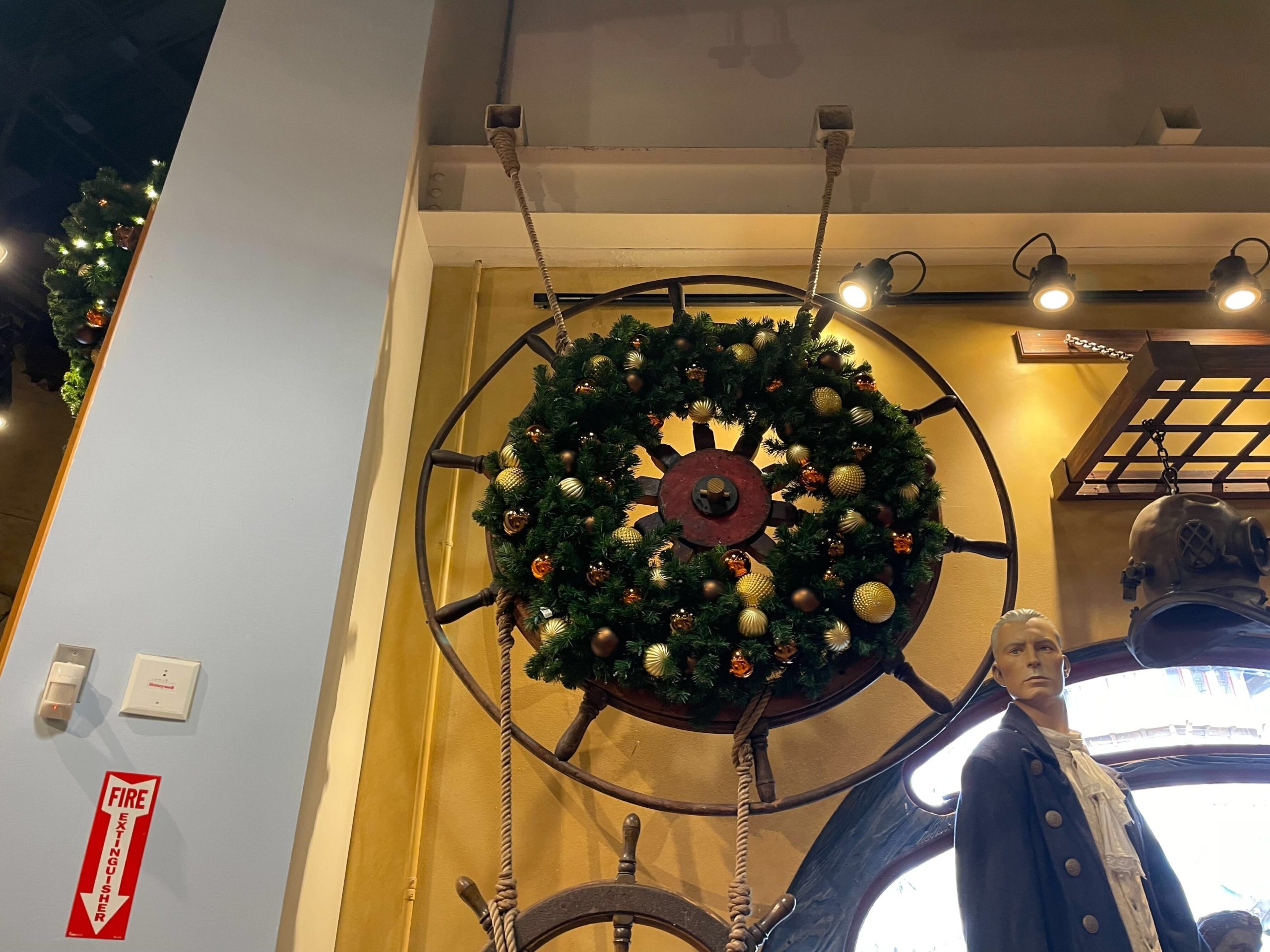 The large ship’s wheel now has a wreath over it.