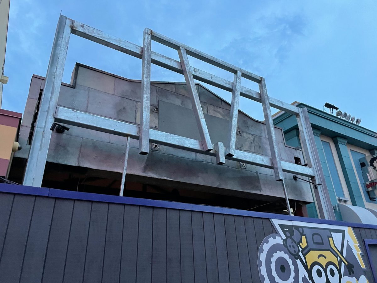 Demolition of Shrek-themed structures at Universal Studios Florida is still underway. The Shrek 4-D attraction closed in January and signage was removed last February. Now a new steel frame has been erected at the entrance of the former attraction.