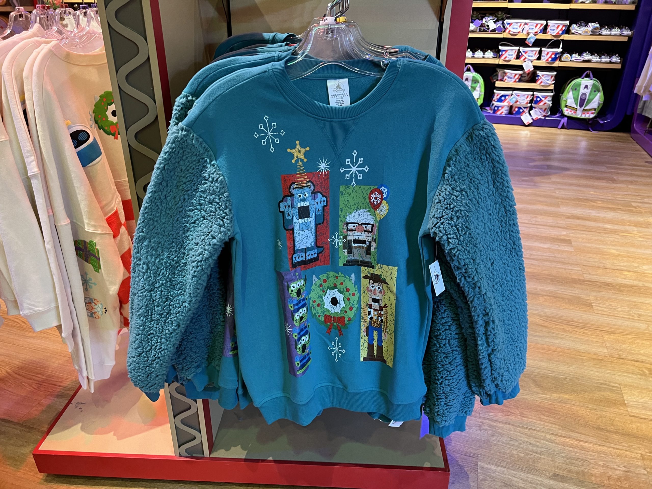There is a new blue sherpa Pixar pullover at Jessie’s Trading Post with some familiar faces. I spy Woody, Mike Wazowski, and Sully to name a few.