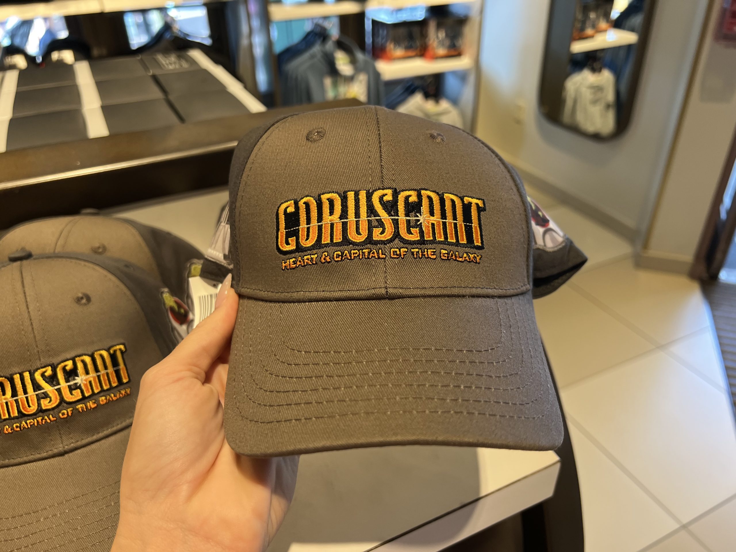 “Coruscant — Heart & Capital of the Galaxy” is on this hat near the apparel.