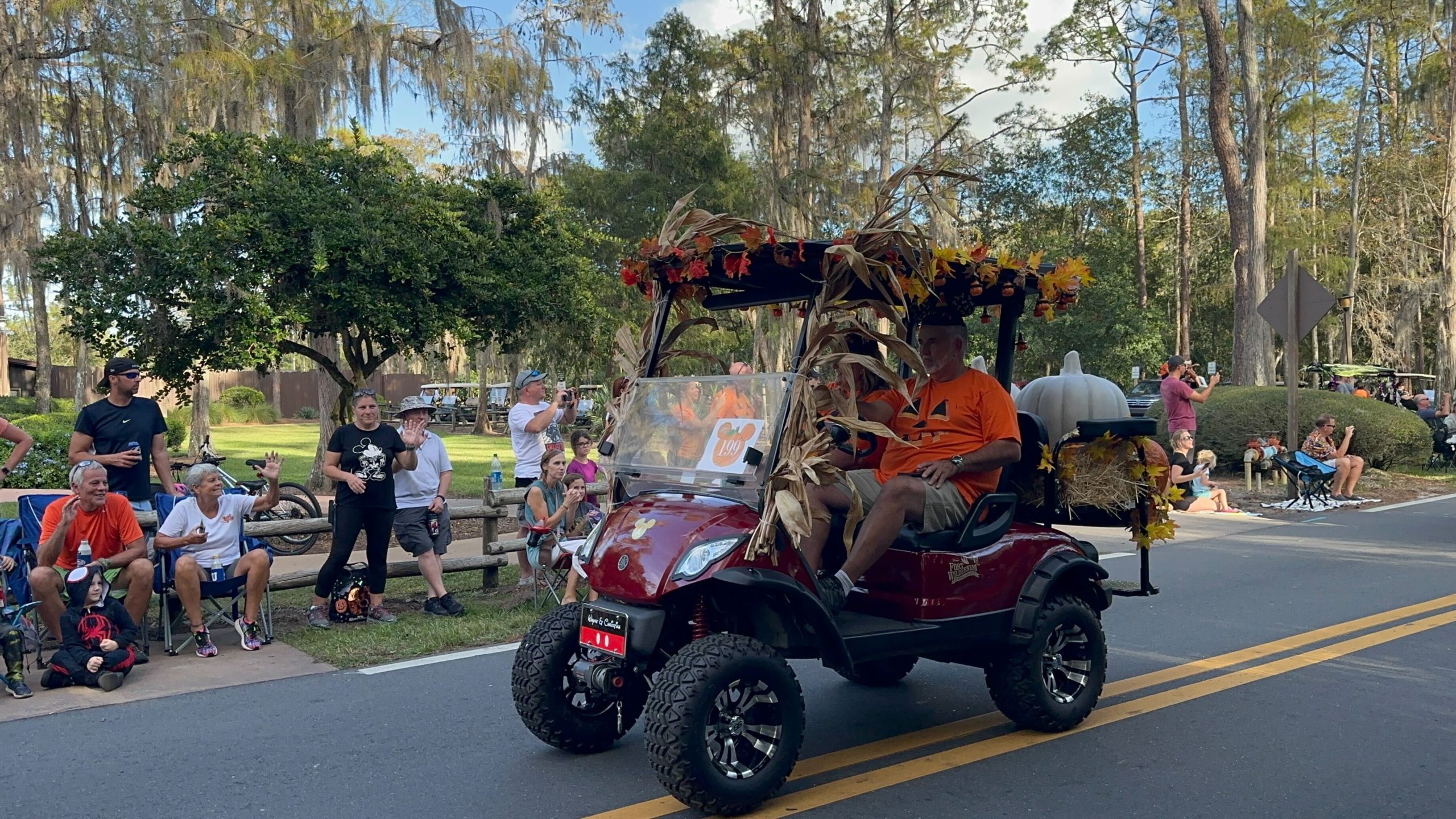 The first golf cart was decorated with classic fall aesthetics like leaves, corn stalks, and pumpkins.