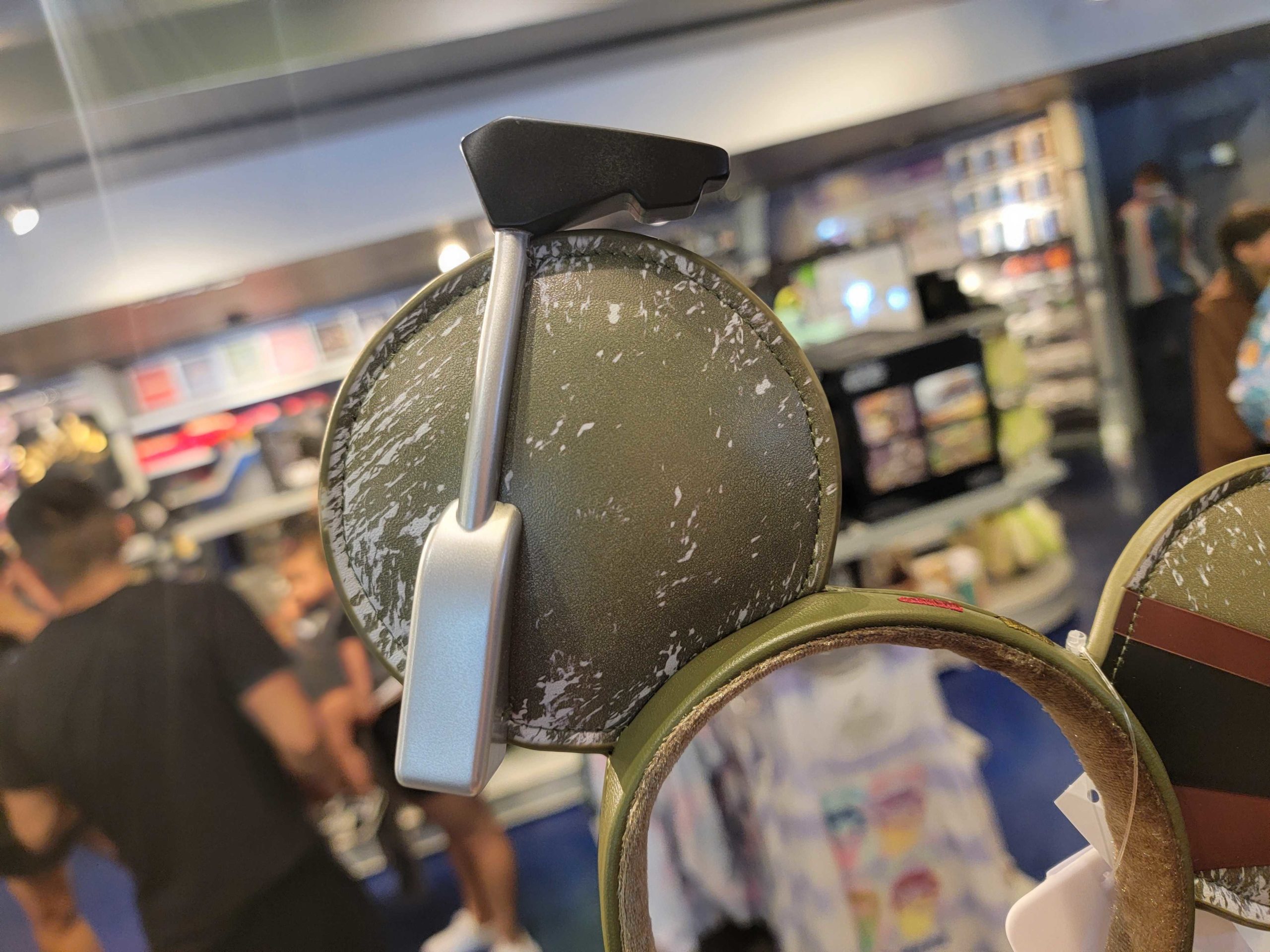 The battle-scarred ear headband is covered in an olive green reminiscent of his armor. The outer headband is also covered in the same material, while the inside has a distressed pale green velour covering.