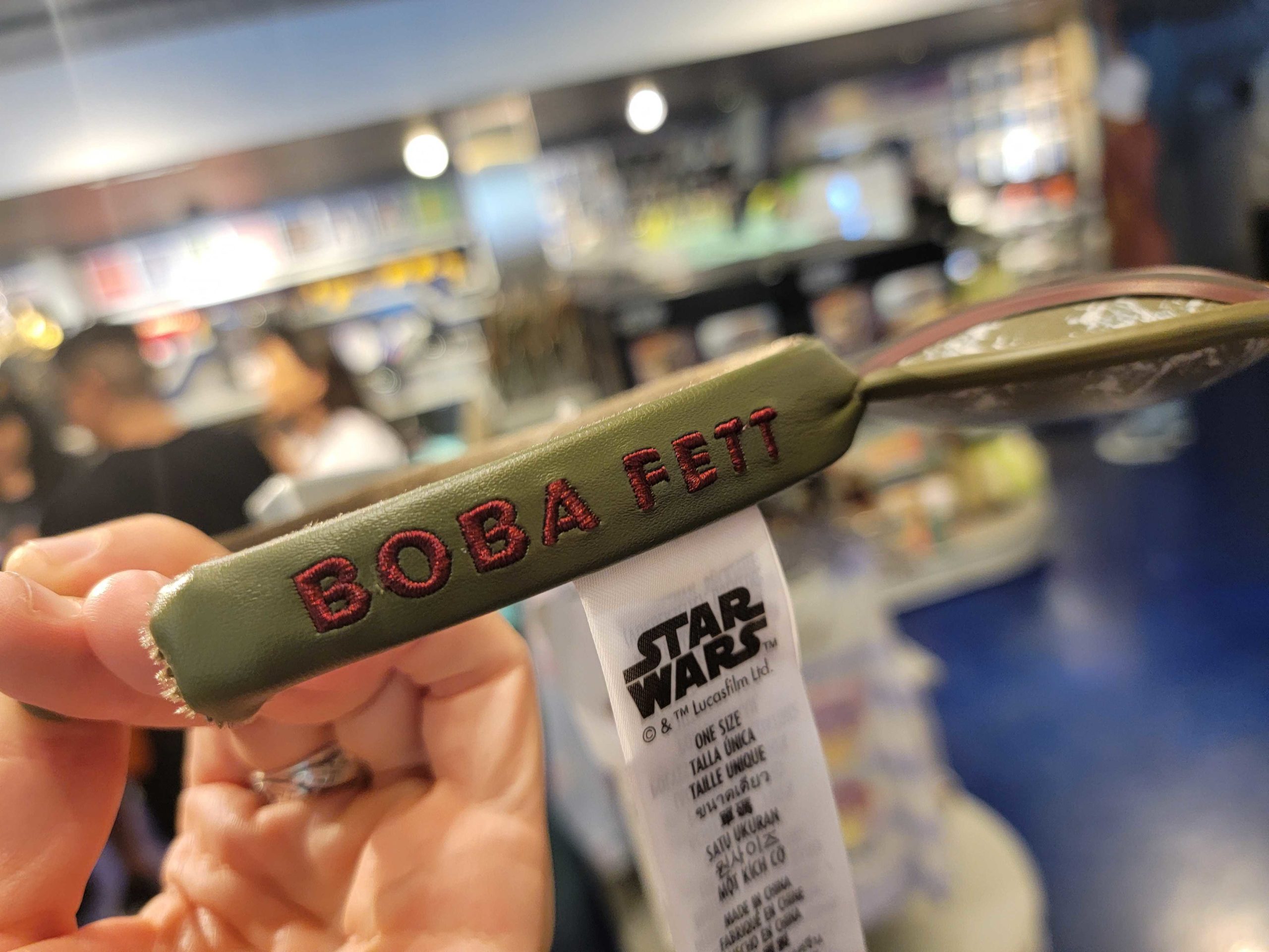 On the left side of the headband is “Boba Fett” embroidered in metallic maroon stitching.