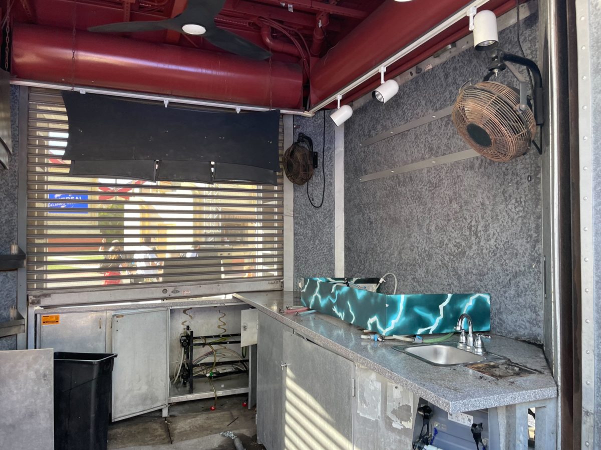 The restaurant closed in May, but Bone Chillin’ remained operational outside the construction walls. The drink stand featured Frankenstein, the Wolfman, and the Creature From the Black Lagoon spinning on top.