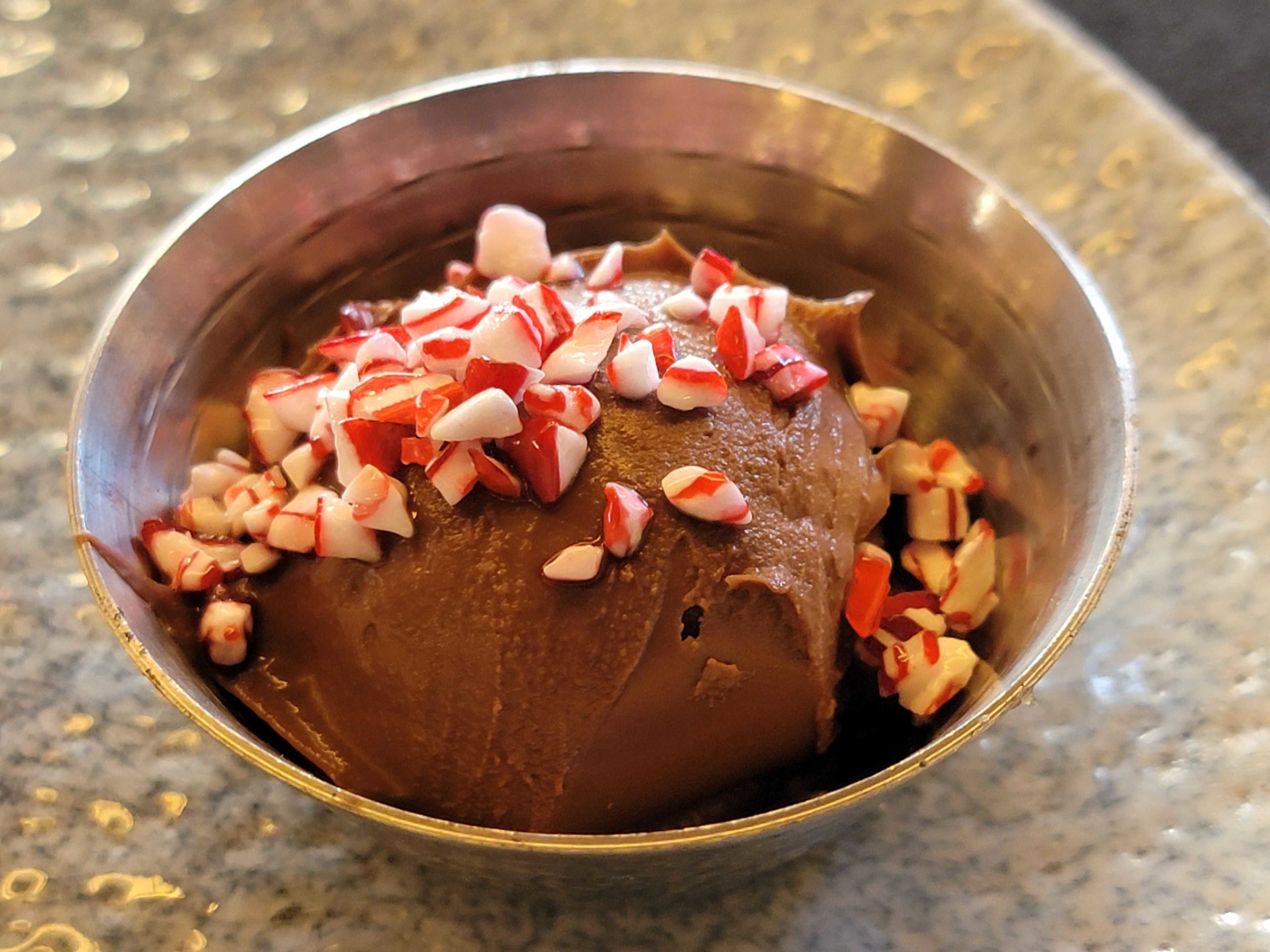 The chocolate sauce is so thick that it isn’t for dipping, more like spreading with a knife. It’s chocolatey and slightly minty, with crushed candy canes atop. Overall, a fantastic dessert or snack worthy of Instagram fame.