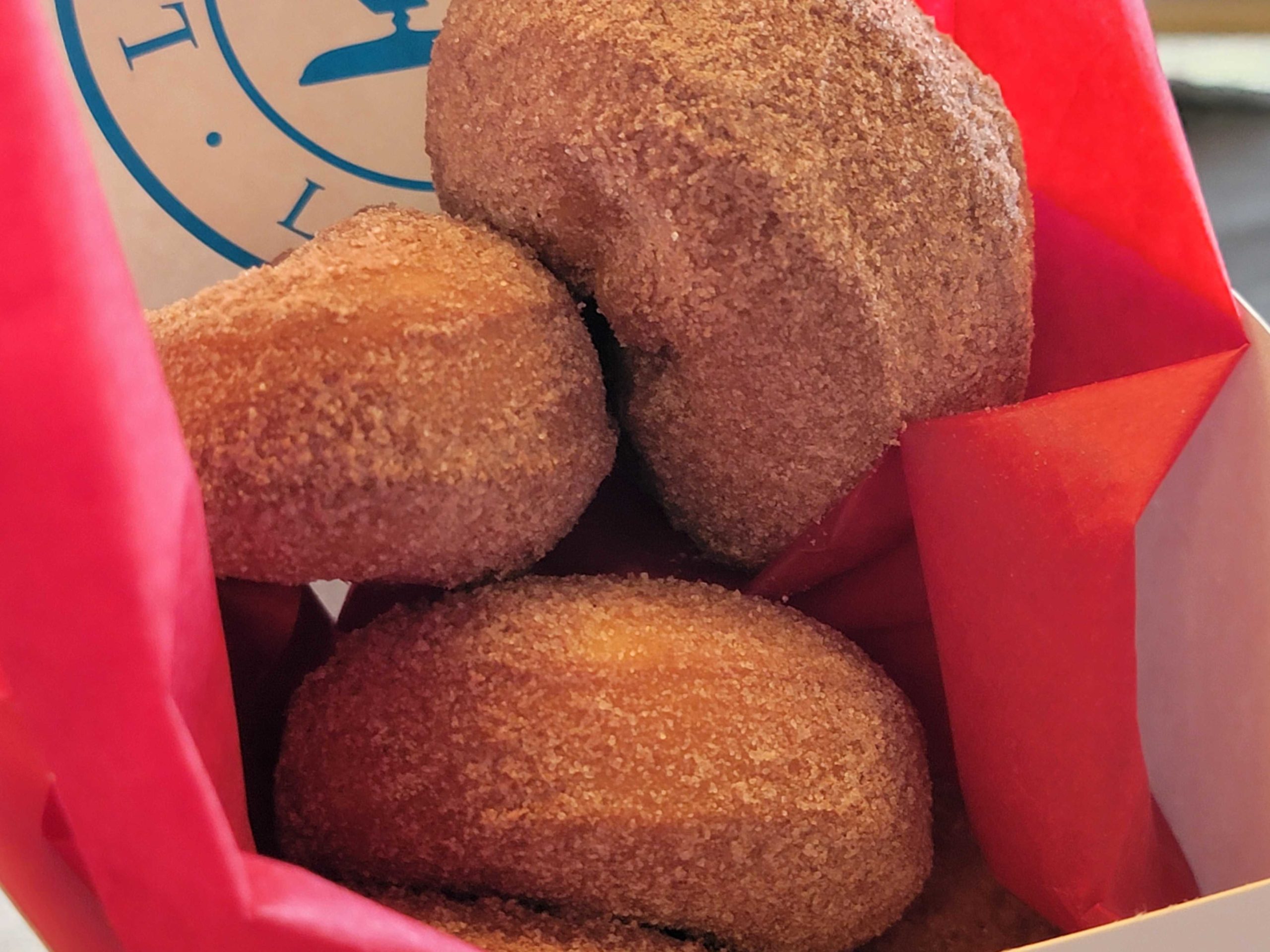 The donuts are perfectly crisp outside, and warm and fluffy inside. The dusting of cocoa elevates these from a donut to a dessert in its own right.