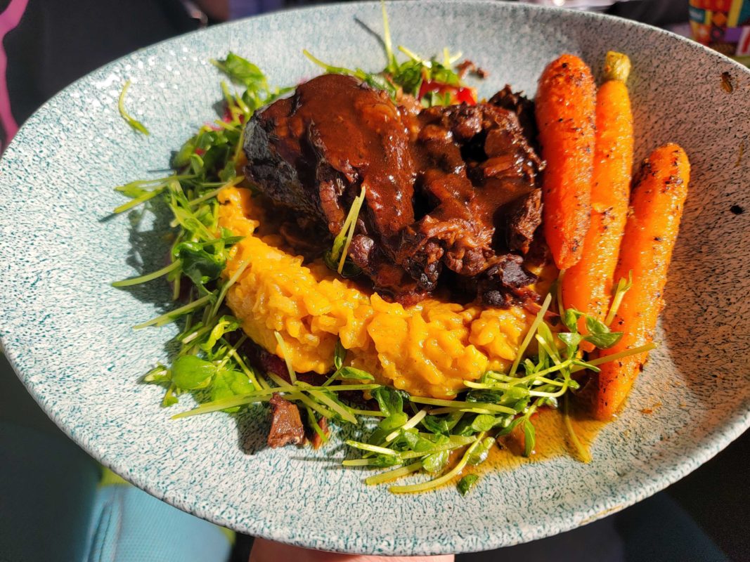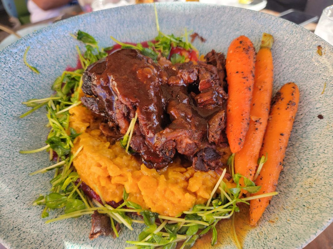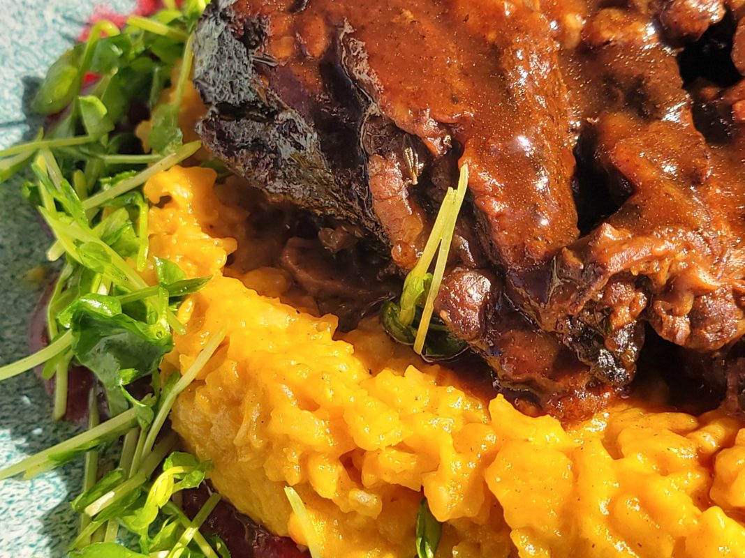 Slow braised beef with carrot risotto and pea tendrils