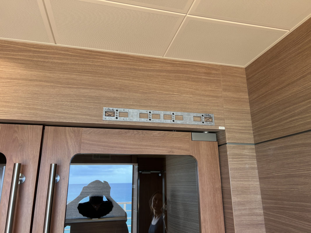 When we were on the Disney Wish this summer, it was evident that the ship was unfinished. Floor numbers were missing from directional signage, as seen above. There were exposed brackets in the rooms, as pictured below.