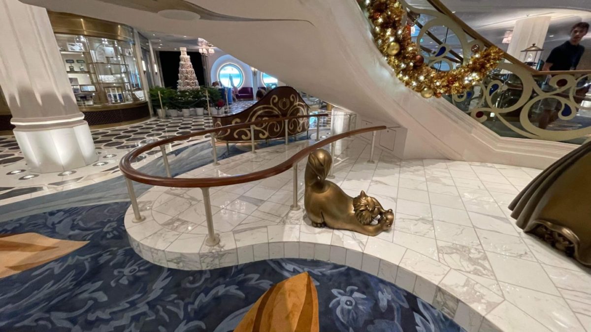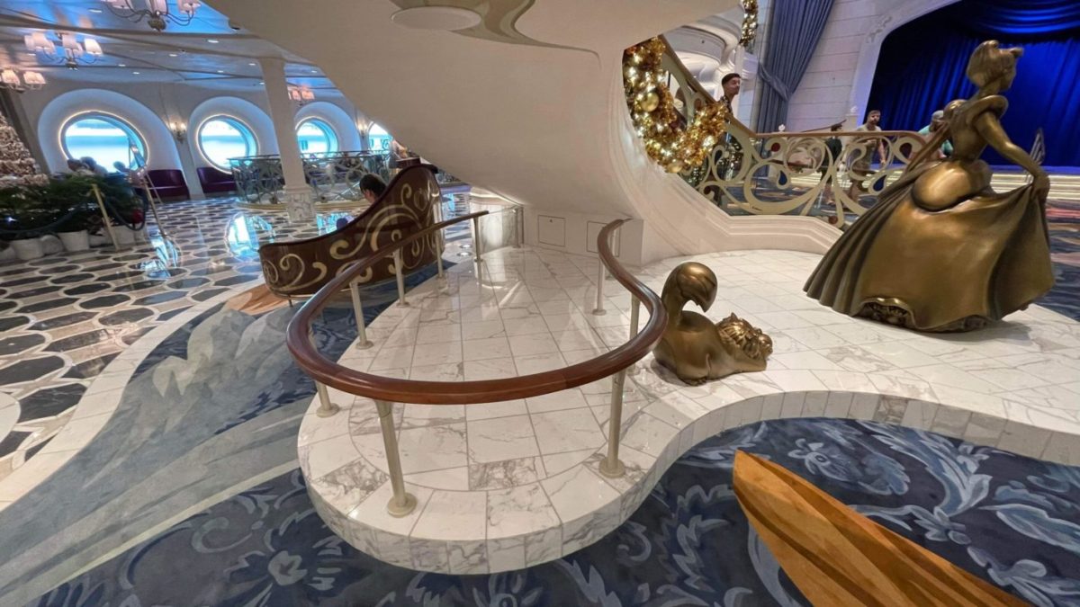 A WDWNT reader sent in photos from aboard the ship, where a third-party company had installed a cane railing in the Atrium overnight. The Cast Members reported the railing was to prevent people from bumping their heads on the staircase.