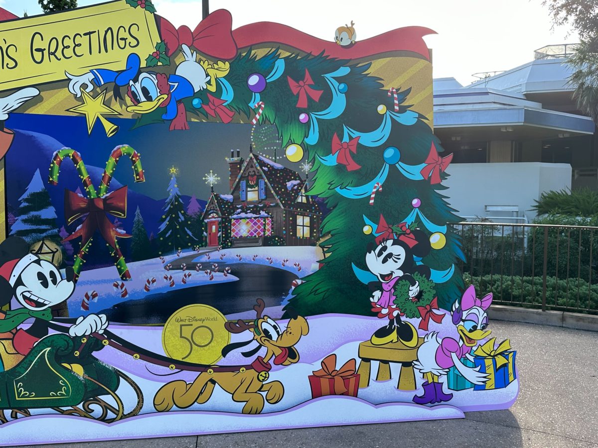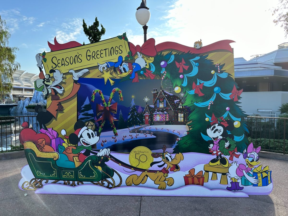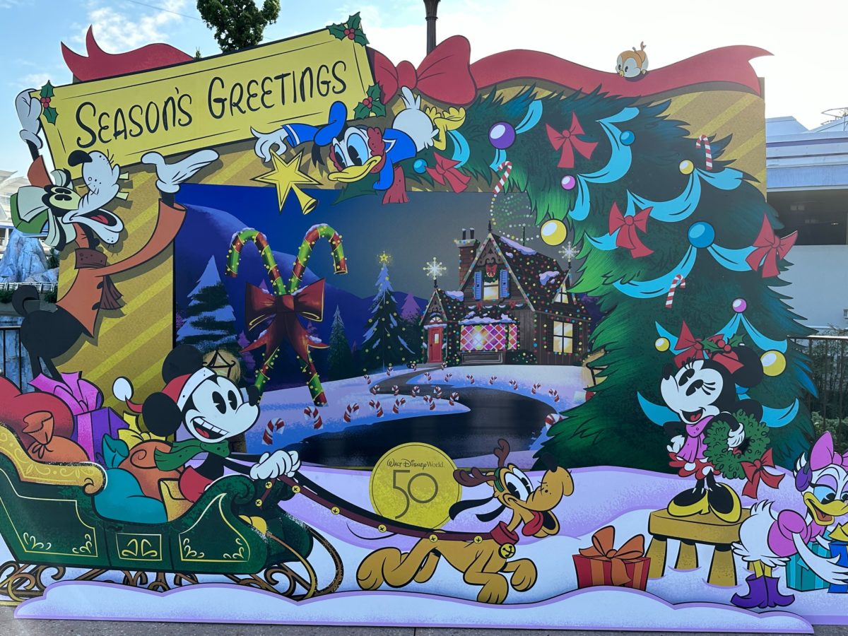 This “season’s greetings” photo op features Mickey and his friends getting ready for the holiday season.
