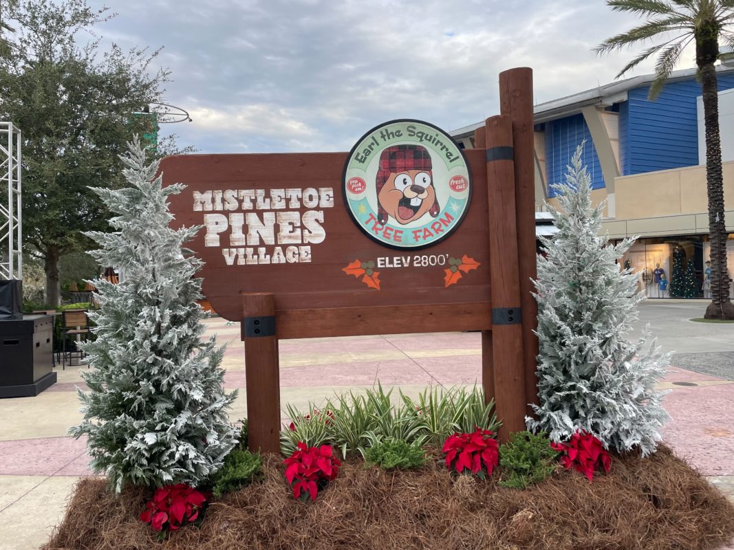 The nearby Mistletoe Pines Village sign also features the logo for Earl the Squirrel’s Tree Farm.