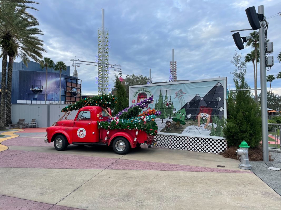 Earl the Squirrel is getting ready for the holidays at Universal CityWalk Orlando. A big red truck carrying Christmas trees and a sign for Mistletoe Pines Village have arrived.