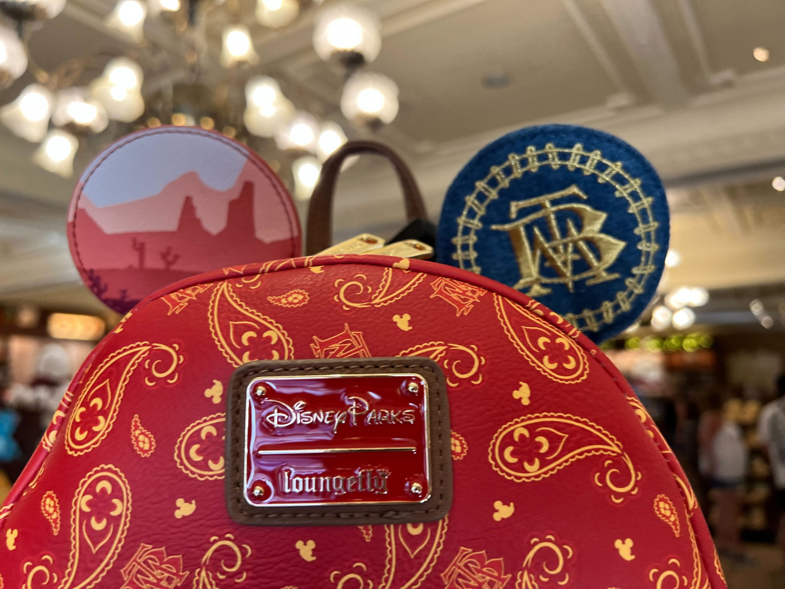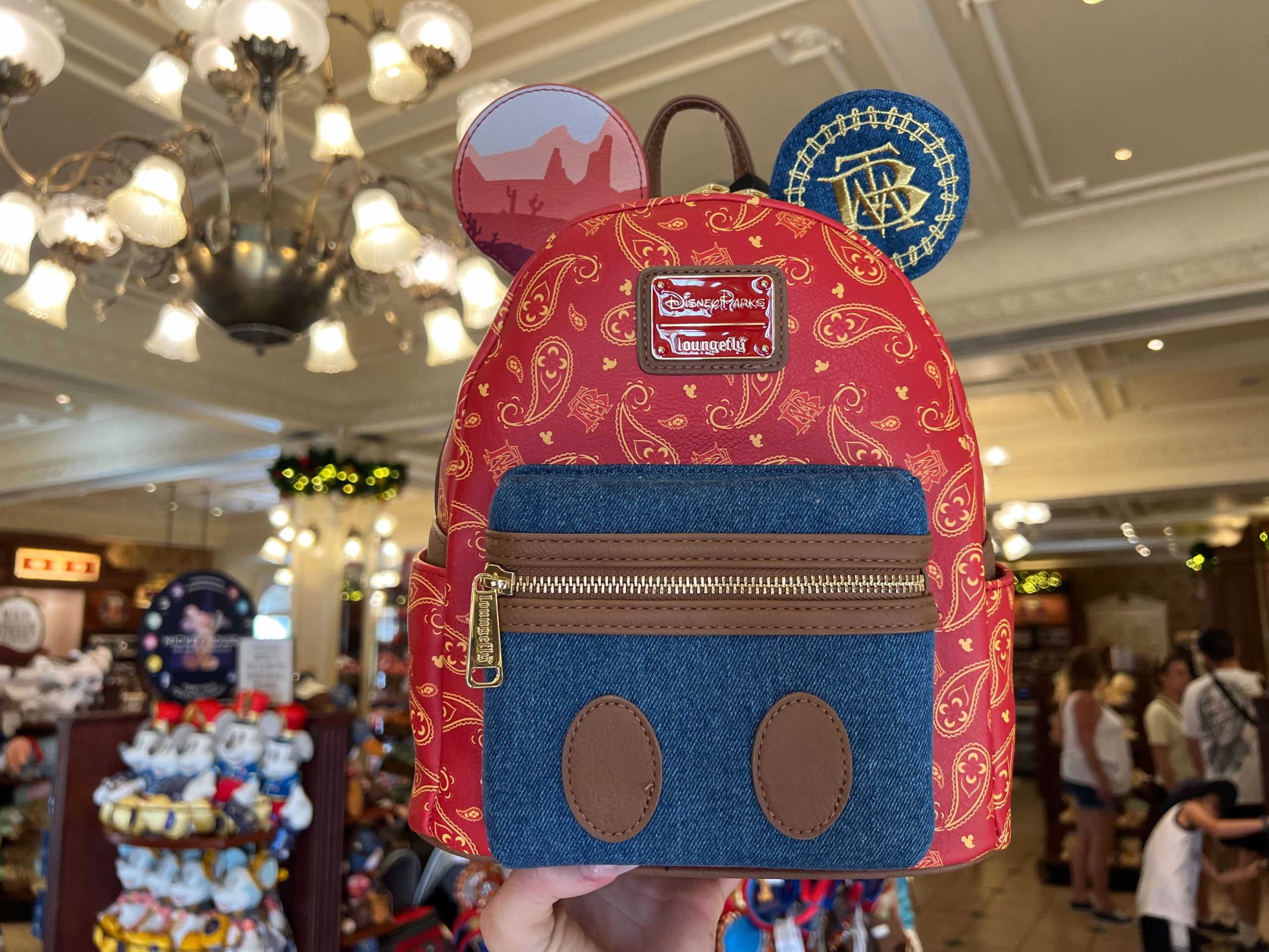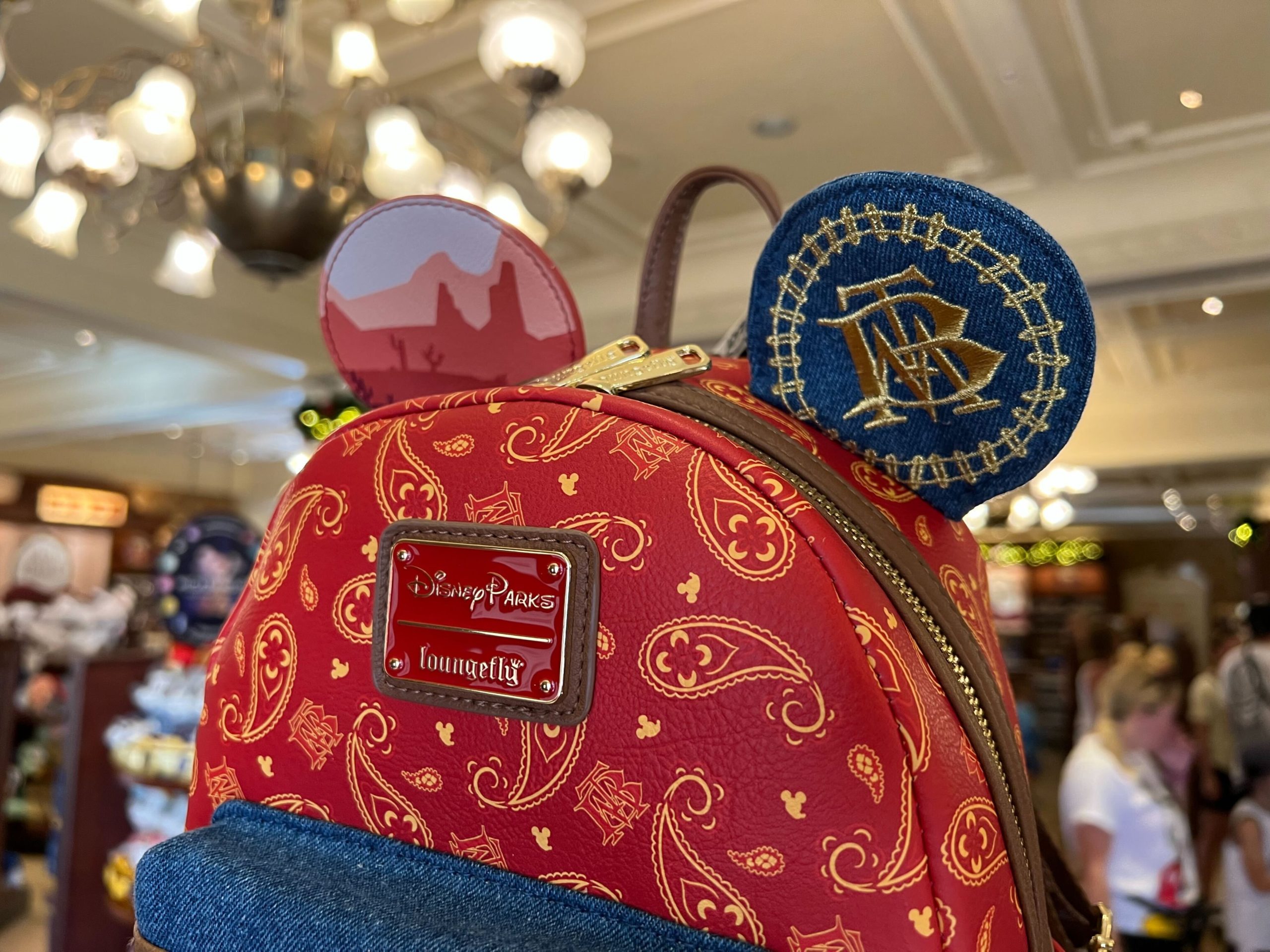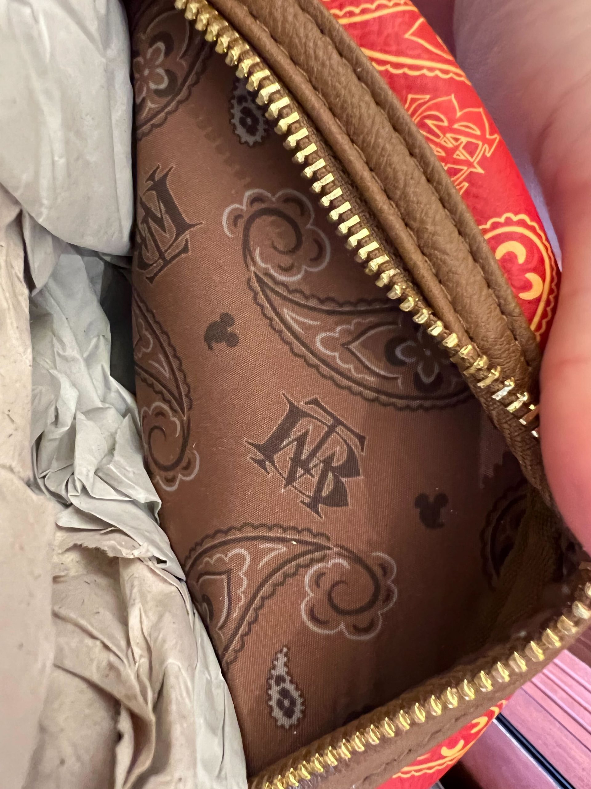 A red paisley print, reminiscent of a bandana, is showcased on the front and sides of the bag, with a brown paisley print on the inside of the bag, complete with the Big Thunder Mountain logo as well.