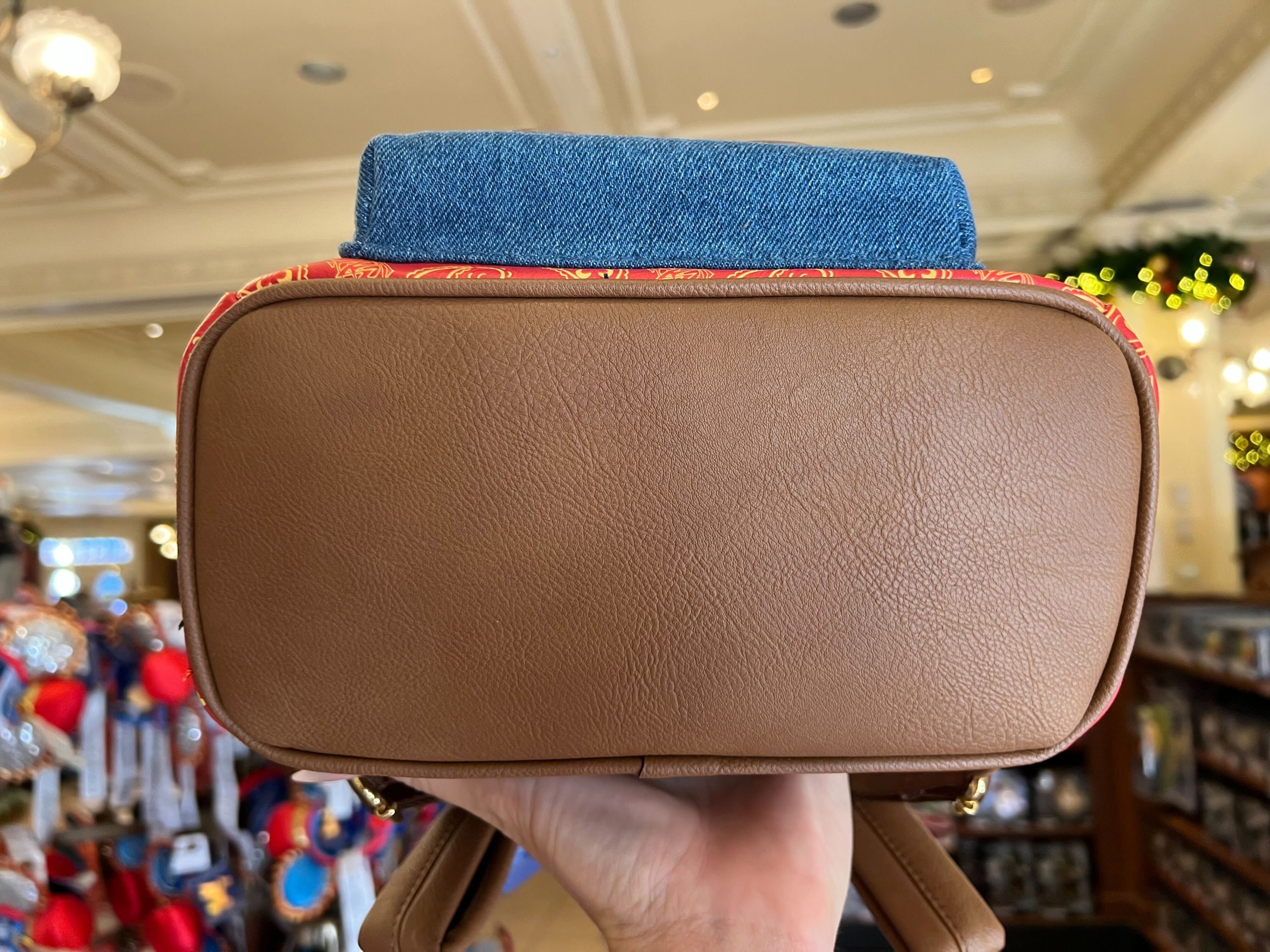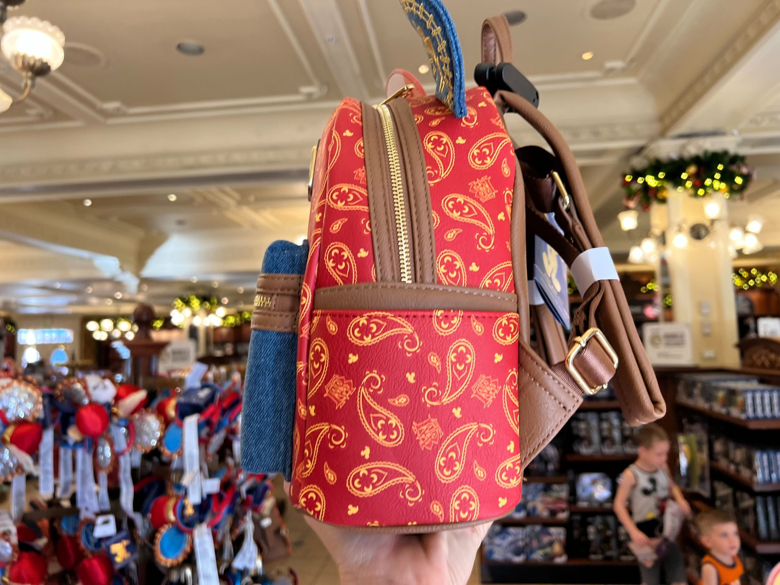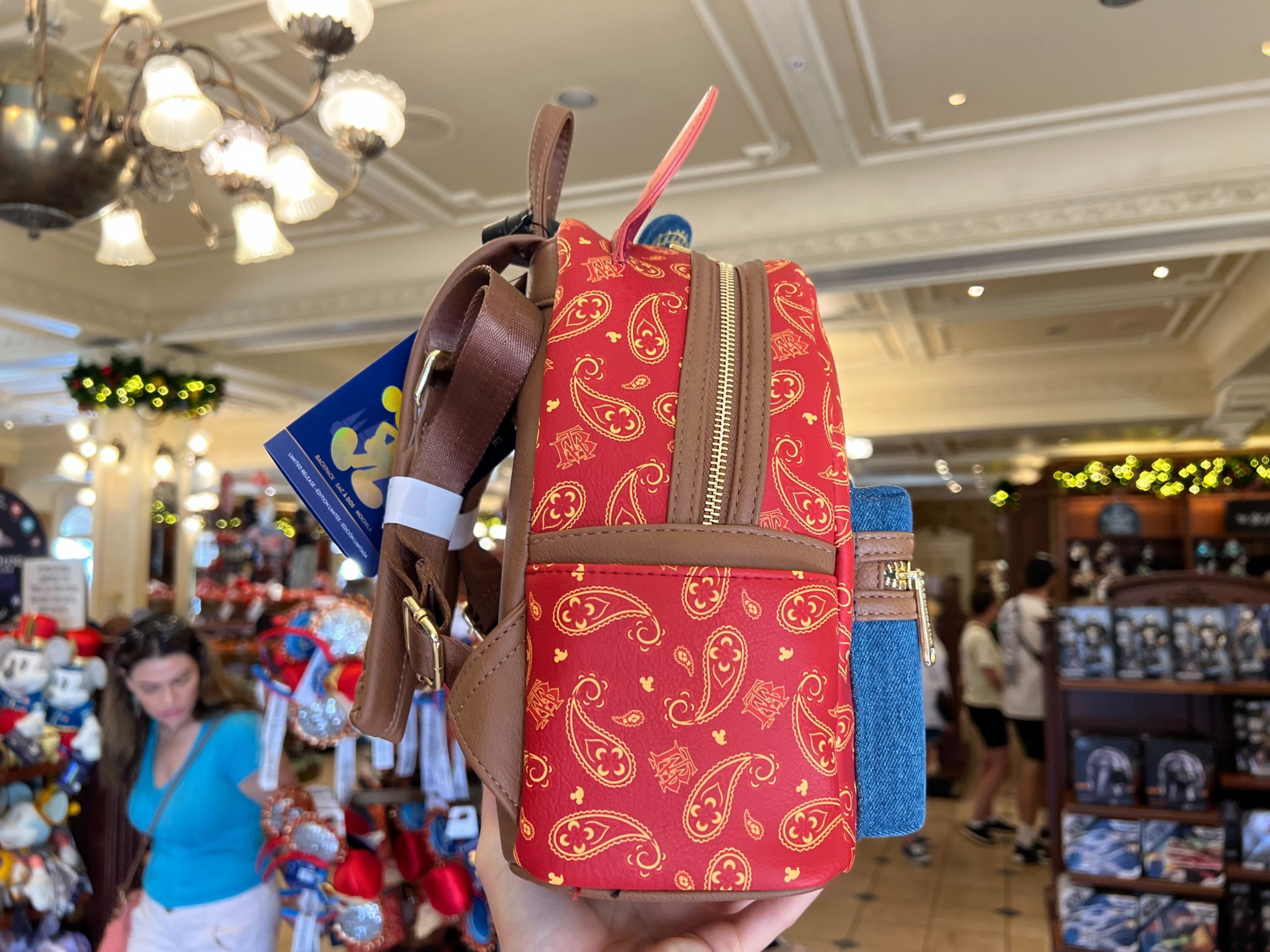 The sides of the backpack are the same red paisley print that is on the front, with a brown faux leather double zipper edge and gold tone zipper. Gold tone hardware can be found throughout the bag, including a red and gold Disney Parks x Loungefly plate on the front.