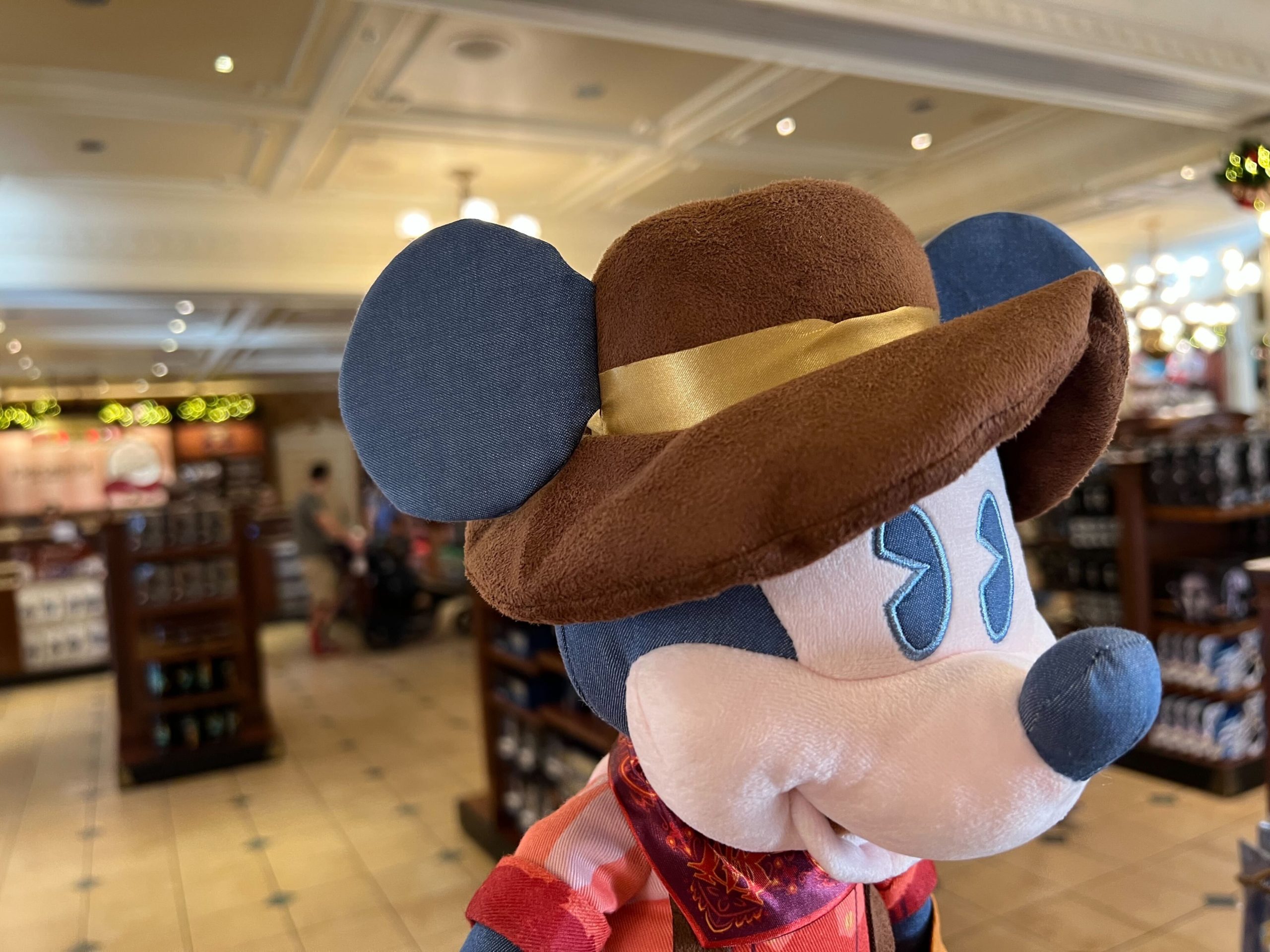 The brown hat adorning Mickey’s head has a gold ribbon encircling it and a Big Thunder Mountain logo bandana around his neck with a desert scene.