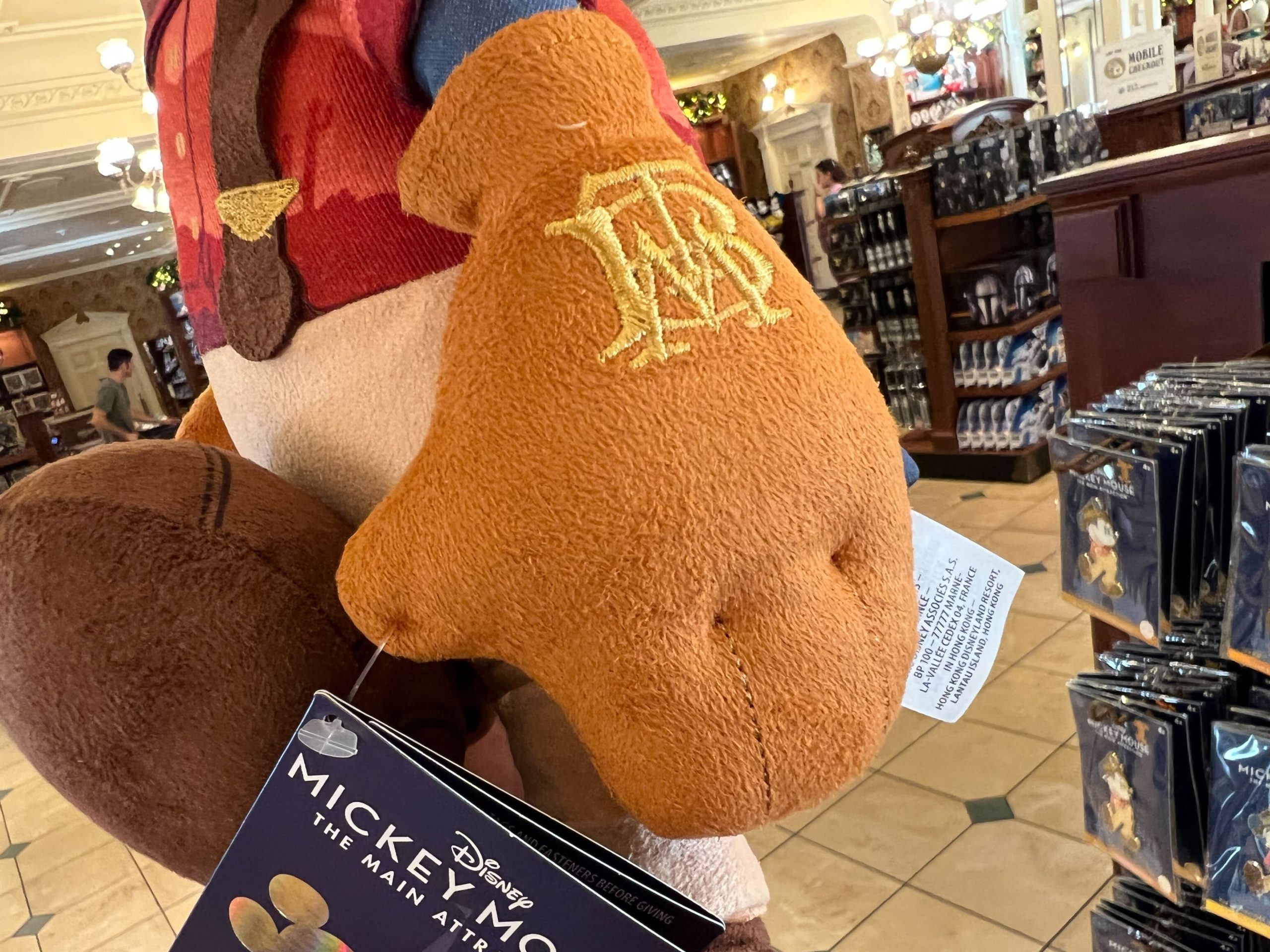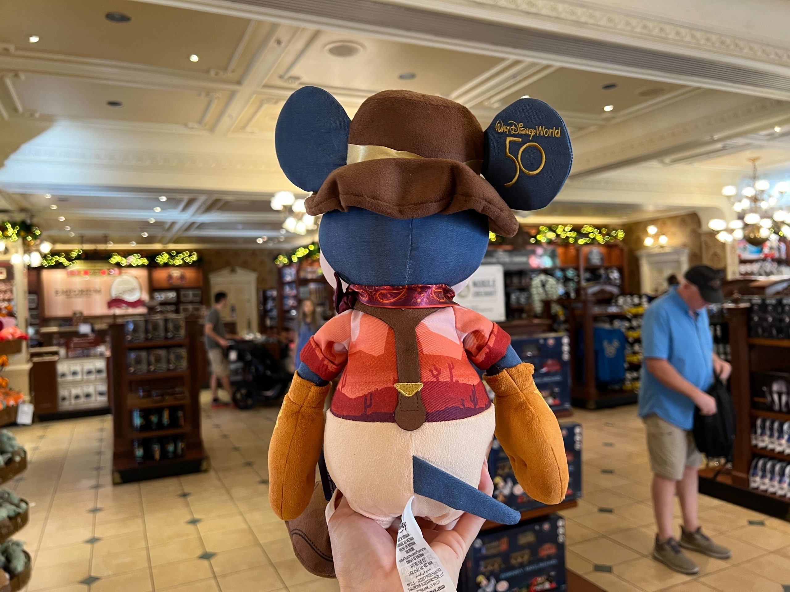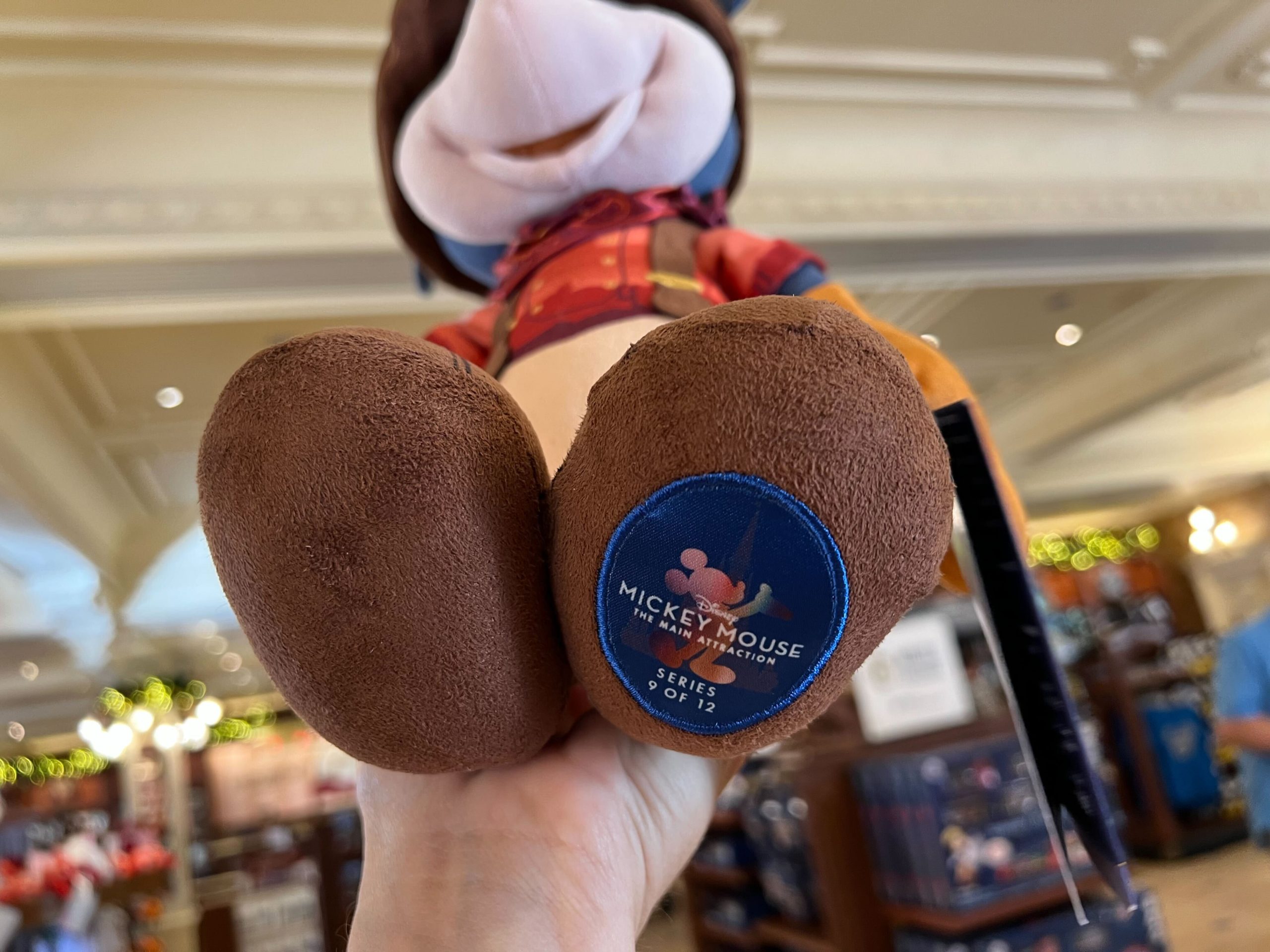 Mickey’s miner costume has faux suede and denim accents with a golden embroidered Walt Disney World 50th Anniversary logo on Mickey’s right ear and a Mickey Mouse the Main Attraction series patch on his foot.