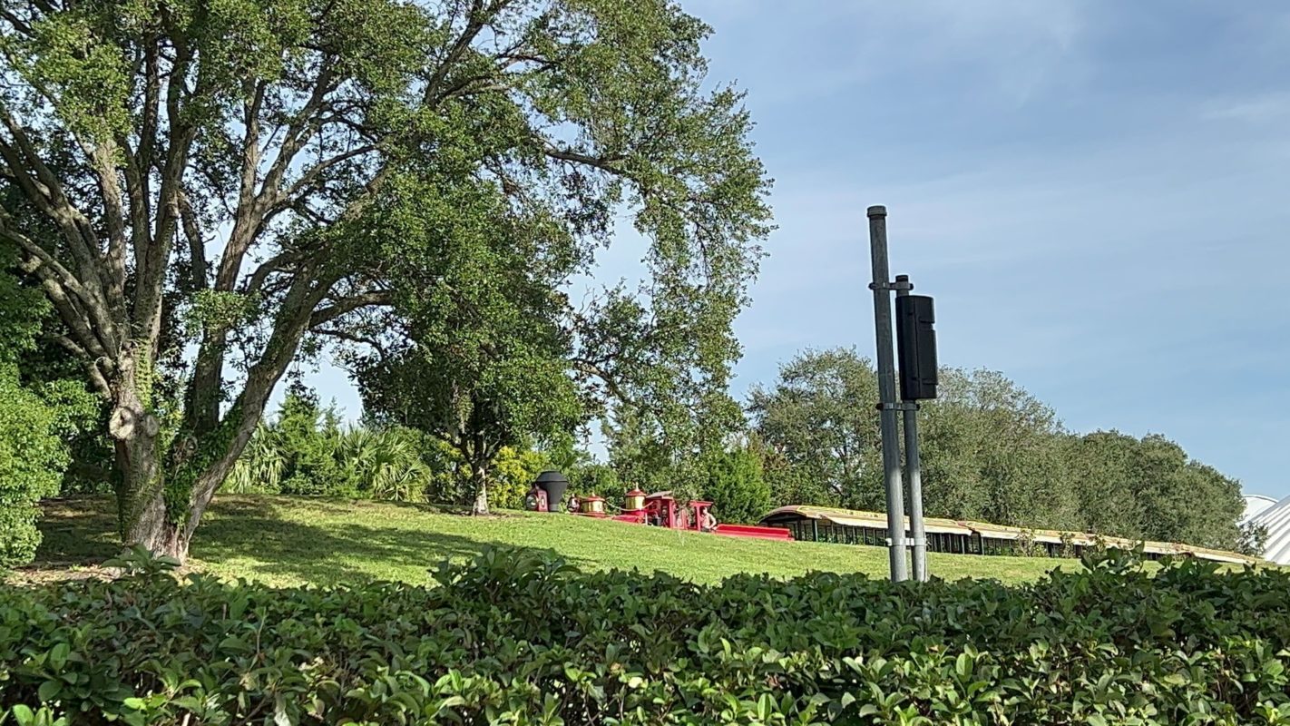 In this photo, if you look to the right side of the photo, just below the large tree, you will see the engine. It is pointing in the direction of the park entrance.