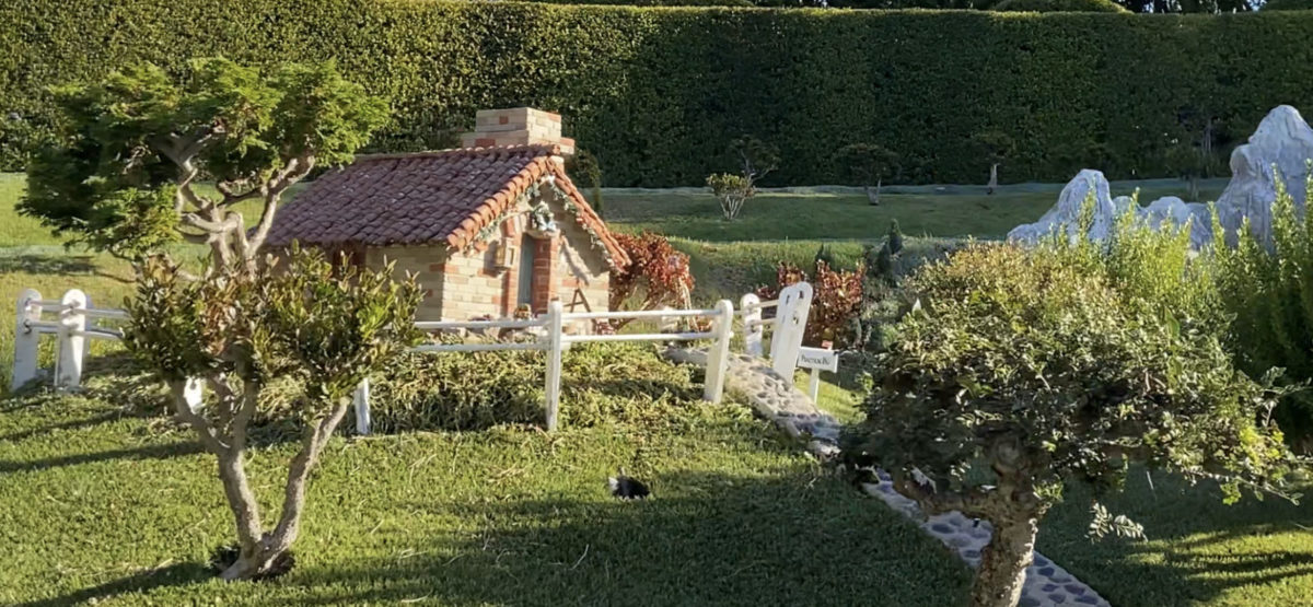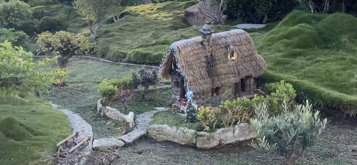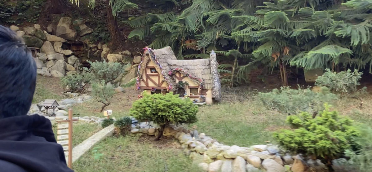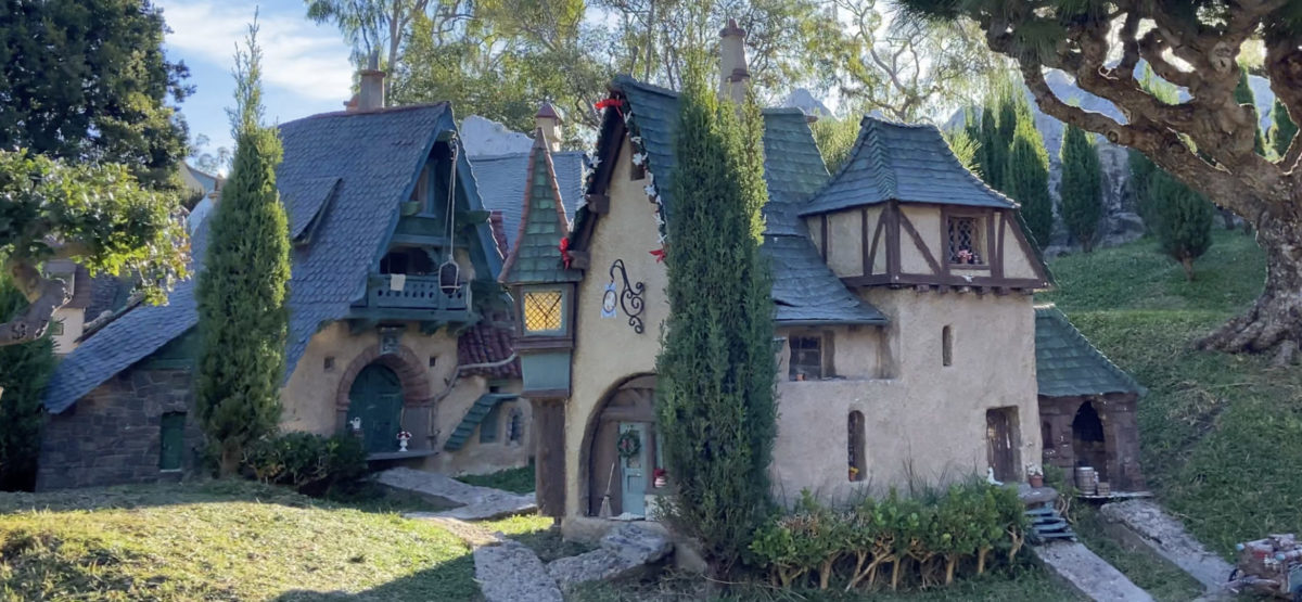 There’s a small Christmas tree with blue decorations outside the “Alice in Wonderland” cottage.