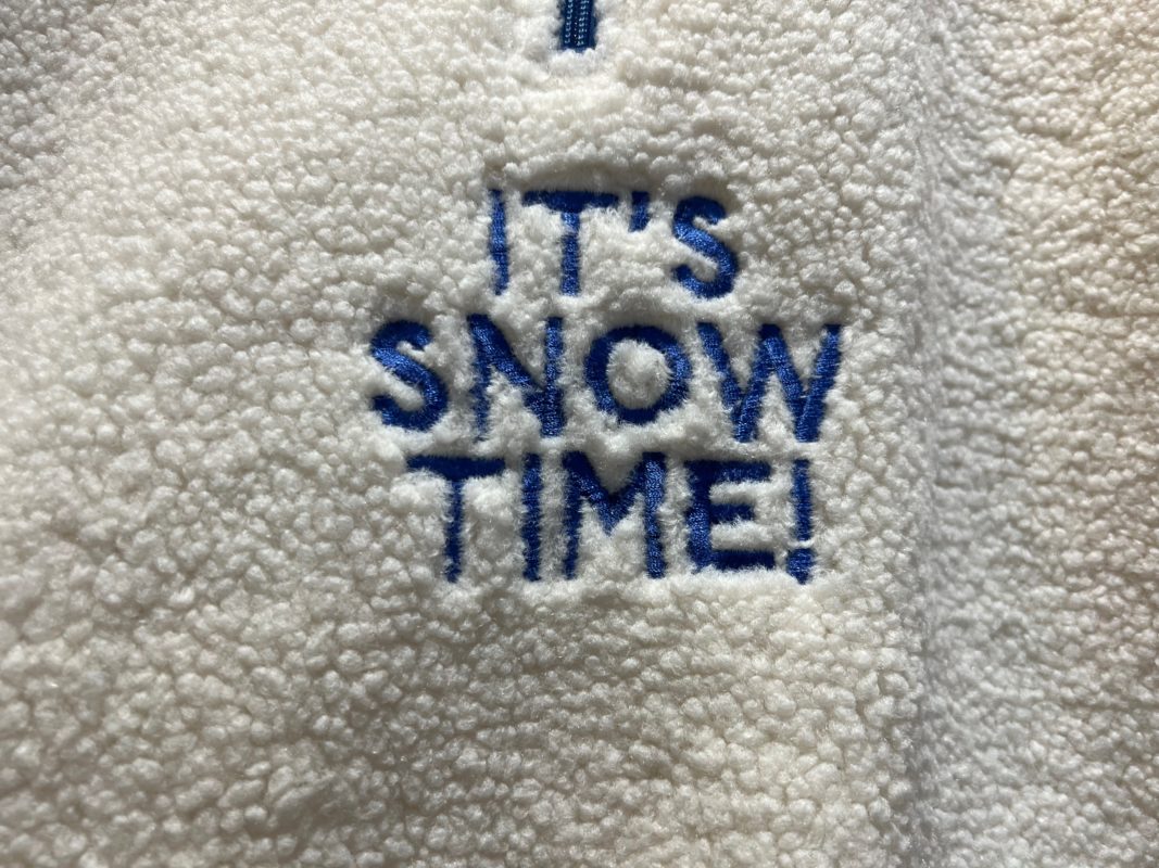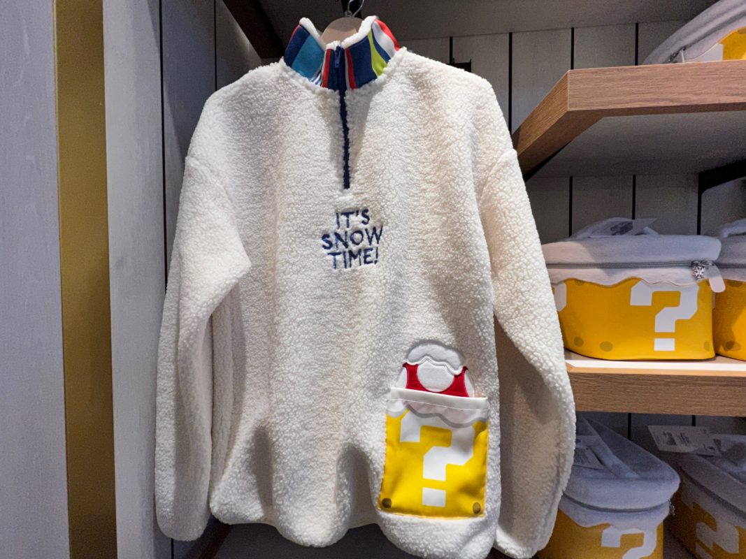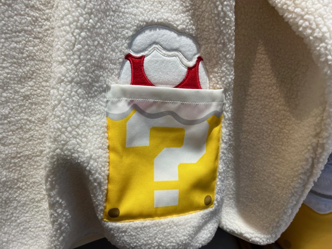 The fuzzy jacket features a pocket with a snowy ? Block, hiding a snowy Super Mushroom.