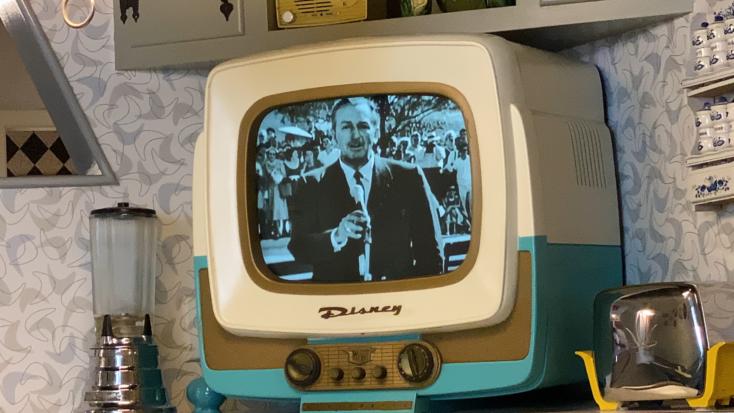 Retro-style televisions play old footage of Walt Disney and Disneyland from the 1950s and ’60s.