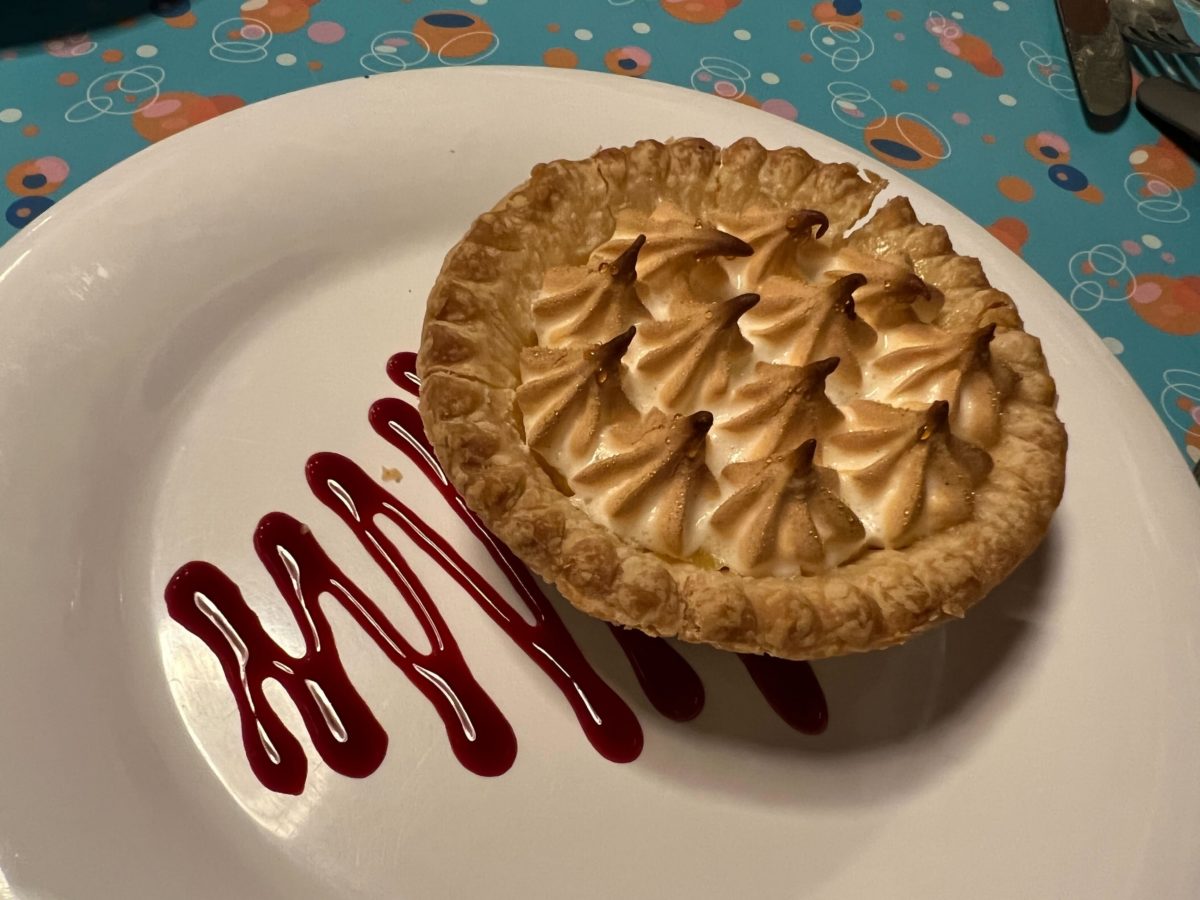 A lemon curd in a flaky pie shell topped with a toasted meringue and garnished with a raspberry sauce