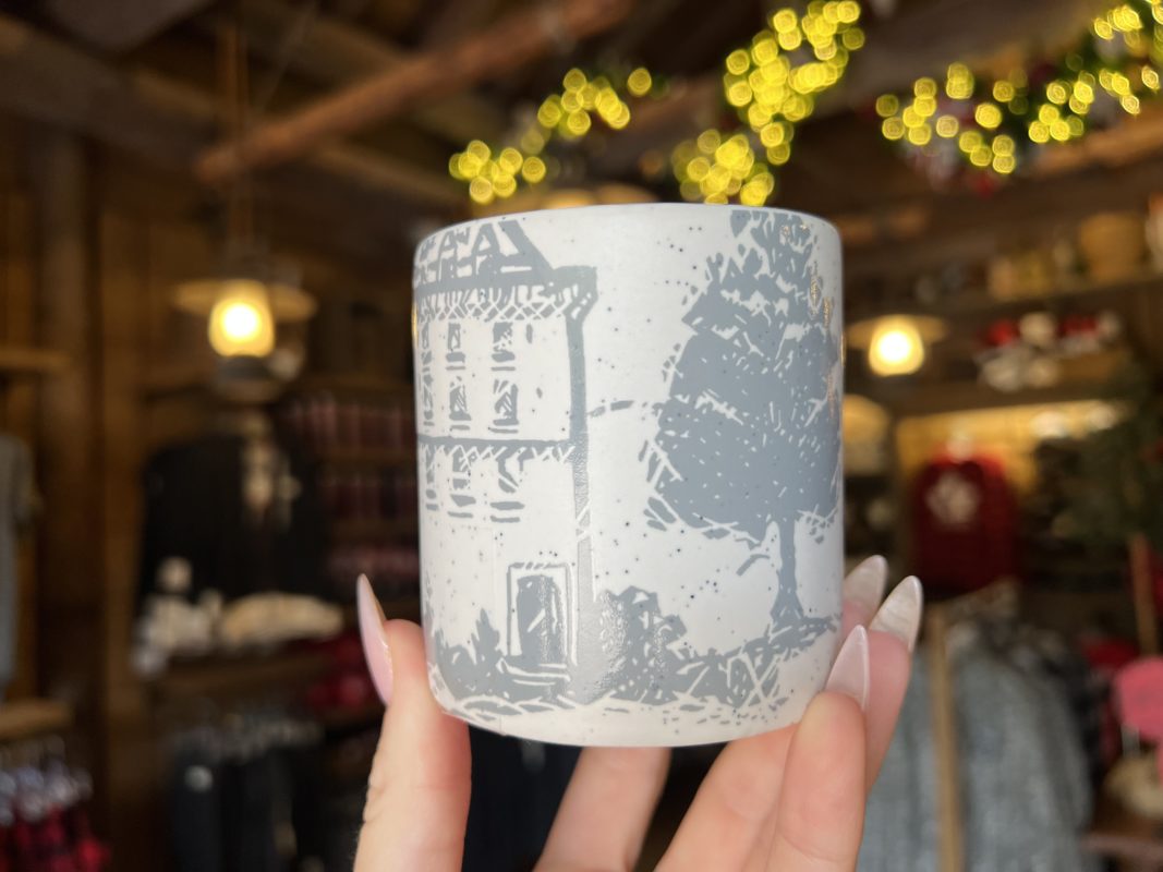This candle comes in a stoneware holder featuring a red maple leaf with a Mickey head at the center.