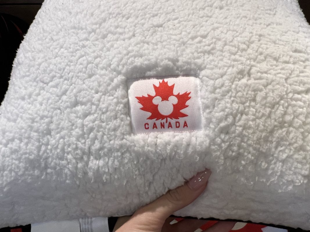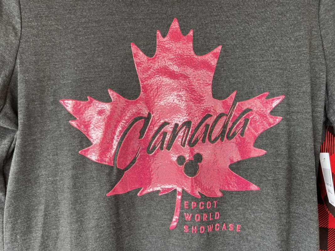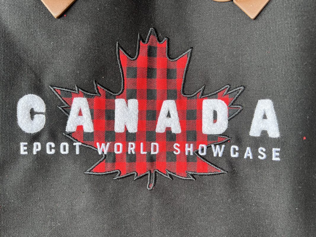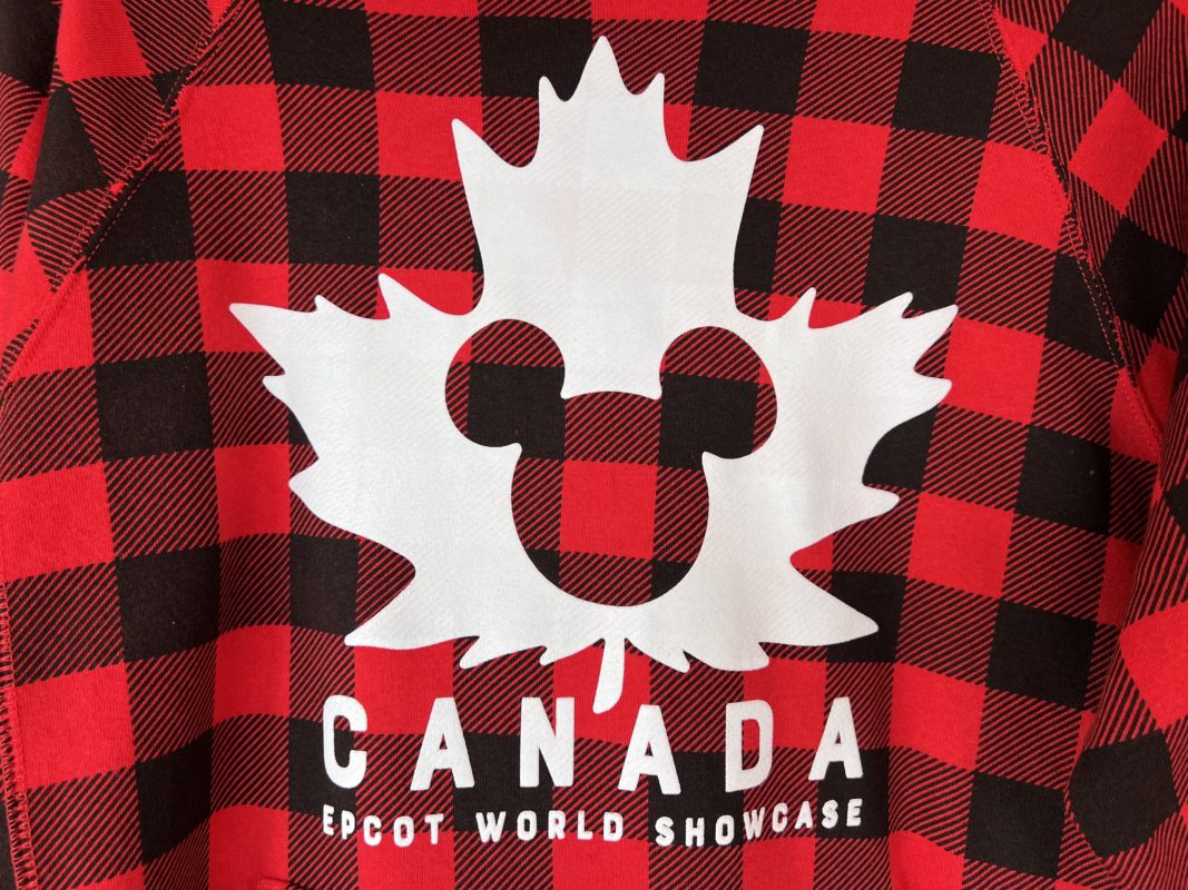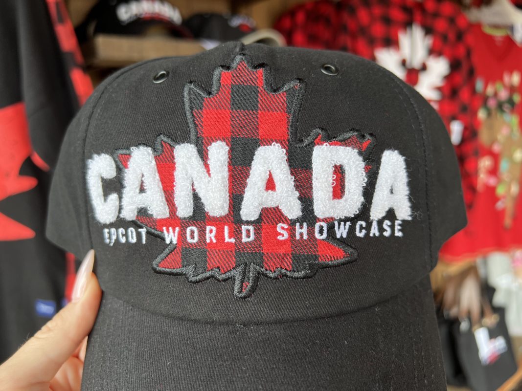 A plaid maple leaf is embroidered on one side, with “Canada EPCOT World Showcase” over it in white letters.
