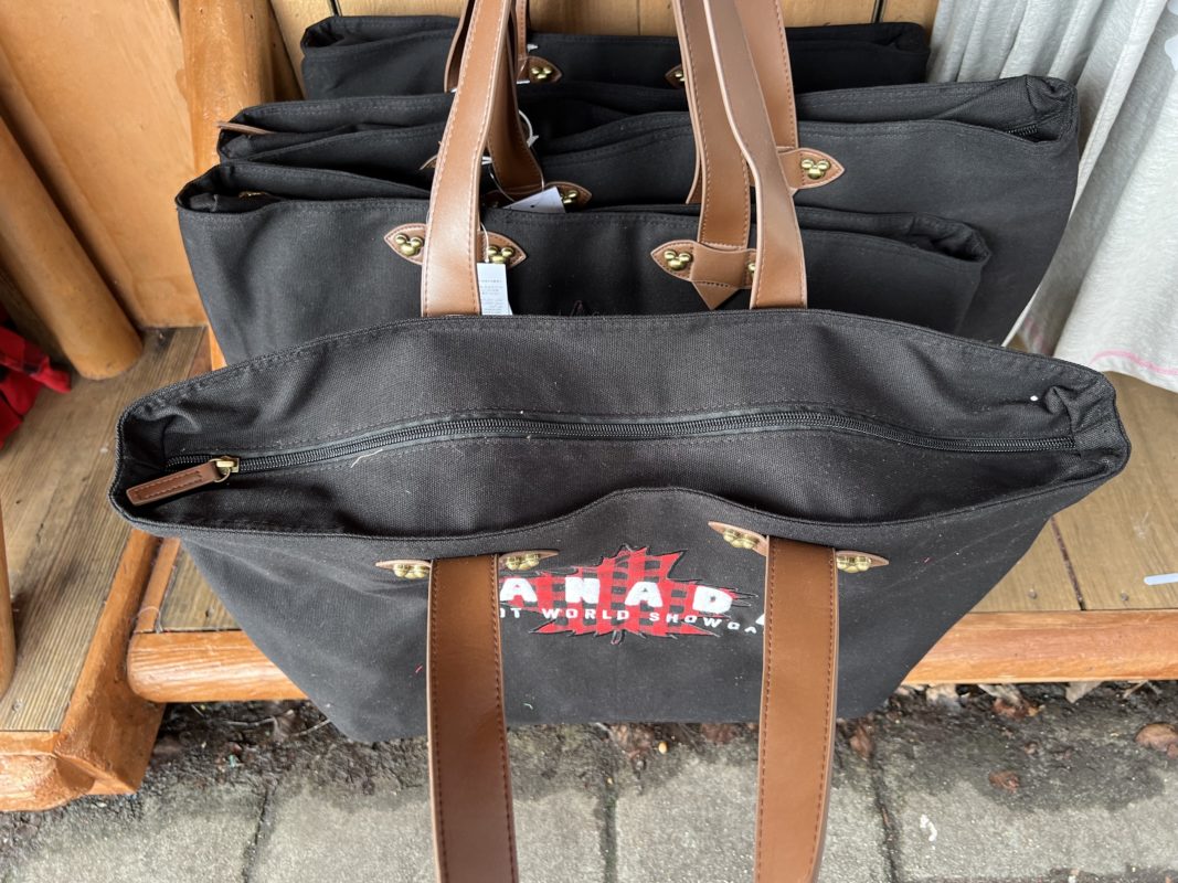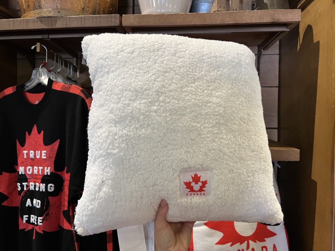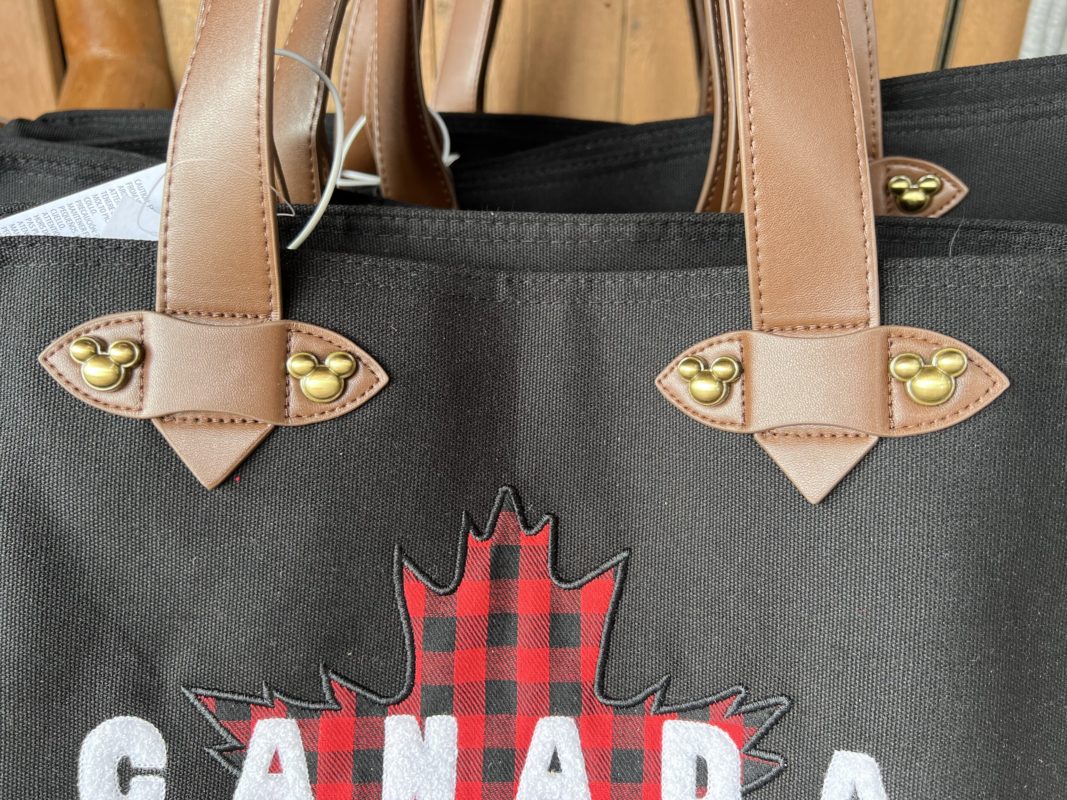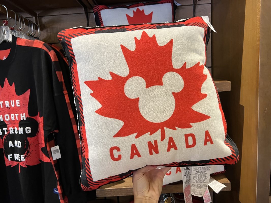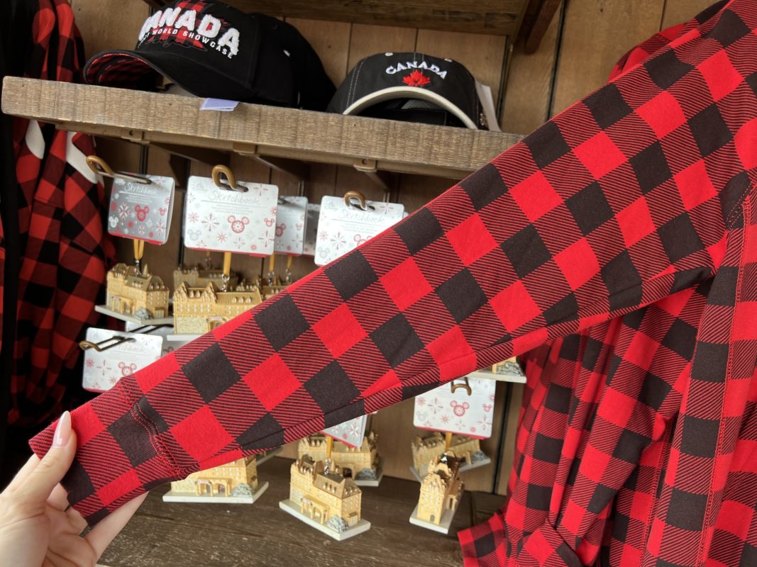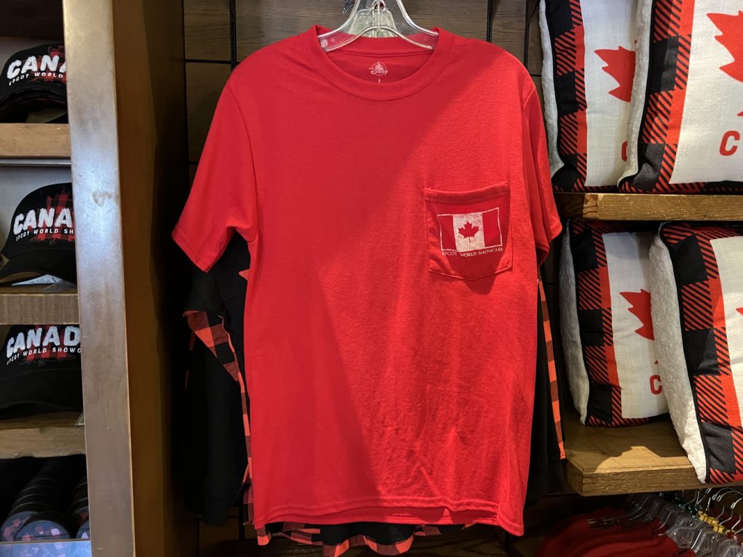 A plaid maple leaf is embroidered on one side, with “Canada EPCOT World Showcase” over it in white letters.