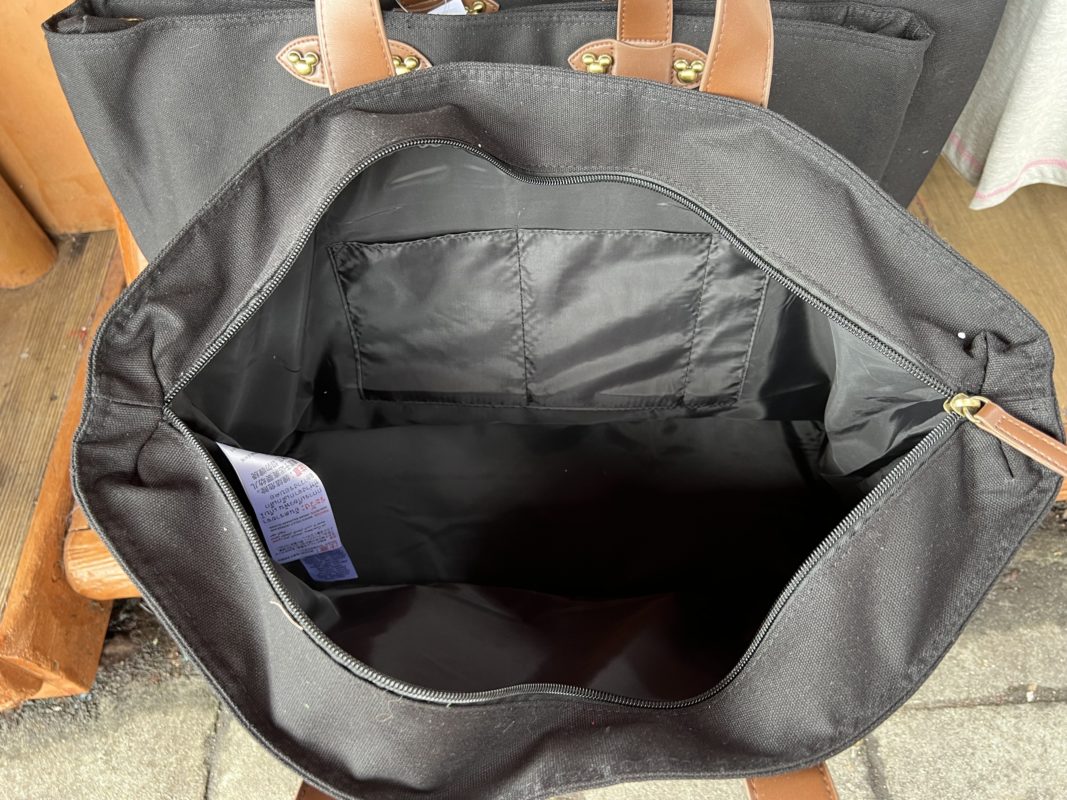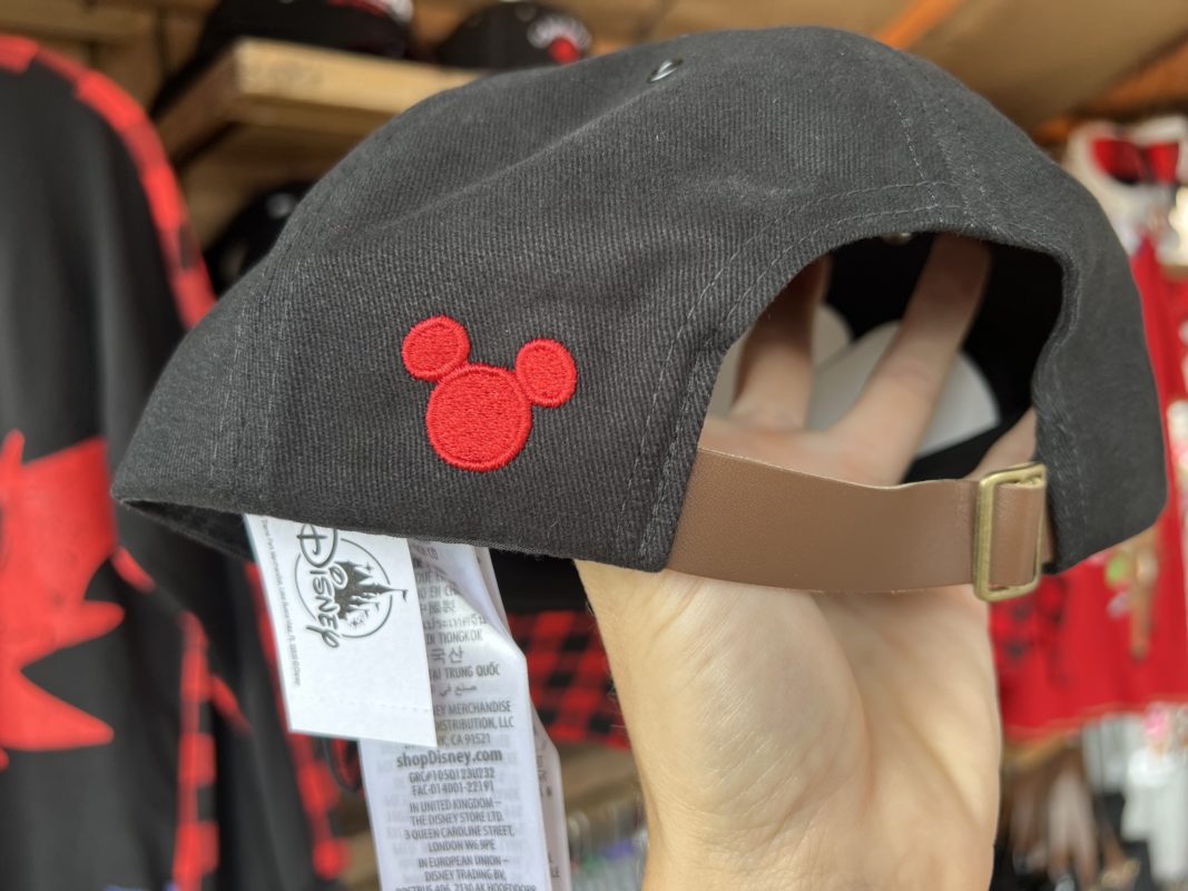 A small Mickey head is at the back, next to the brown adjustable strap.