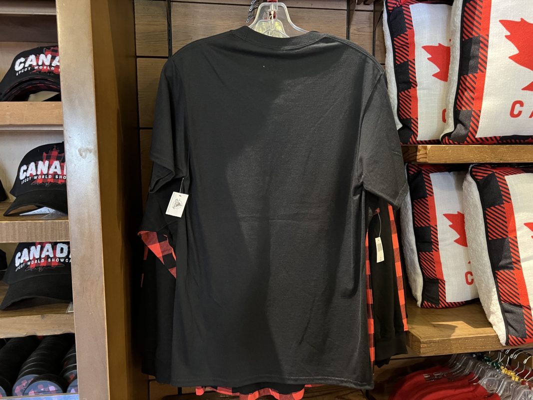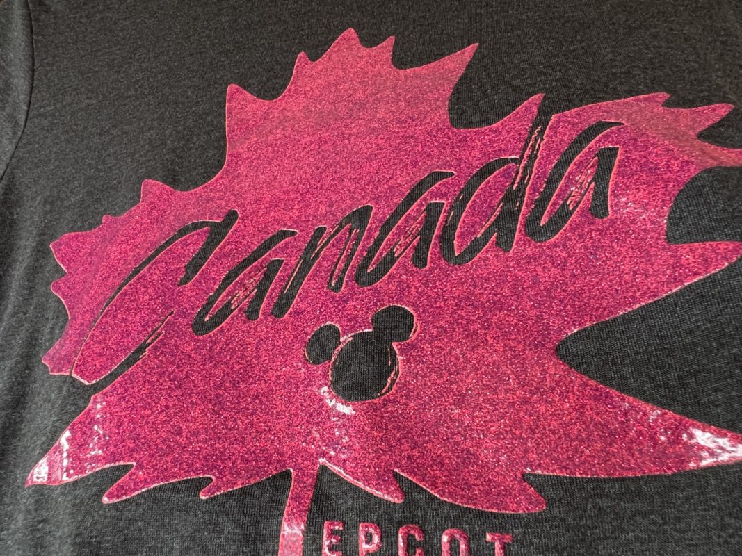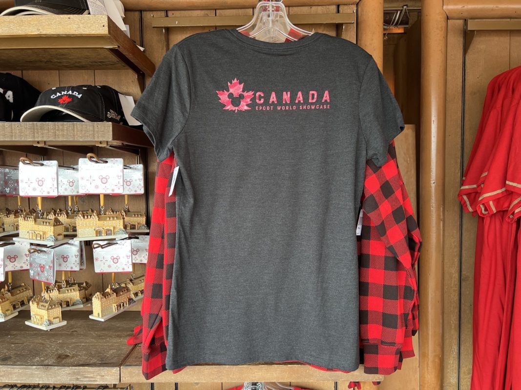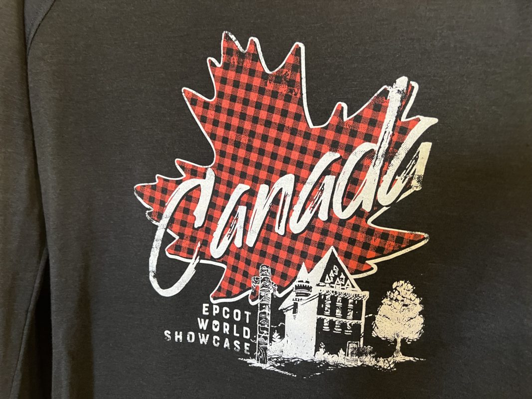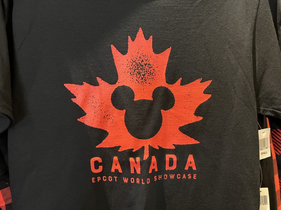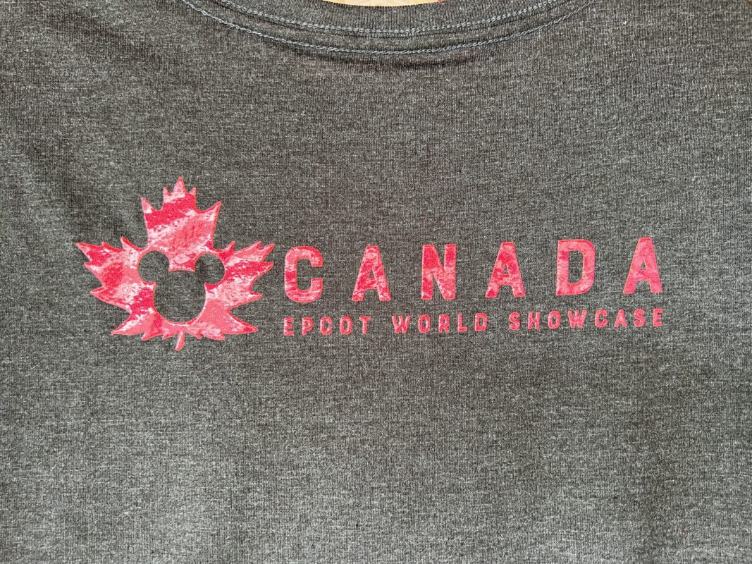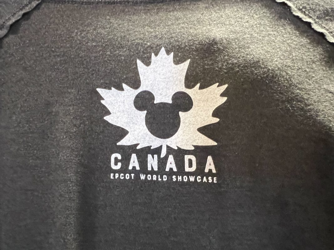This T-shirt is black, with the same maple leaf and Mickey logo on the front, above “Canada EPCOT World Showcase.”