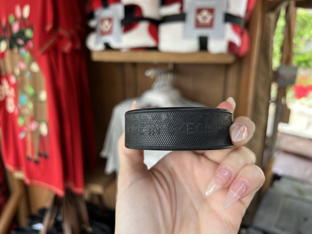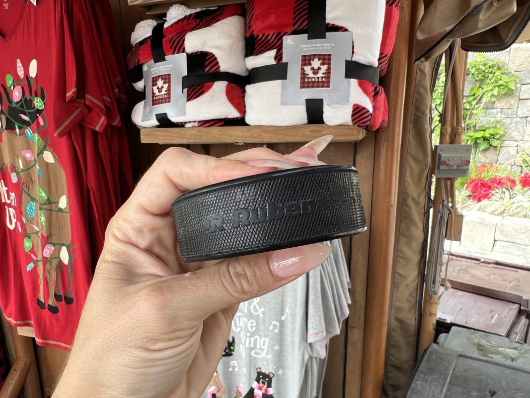Of course, Canada is known for their hockey. This hockey puck has a plaid pattern and a maple leaf on one side.