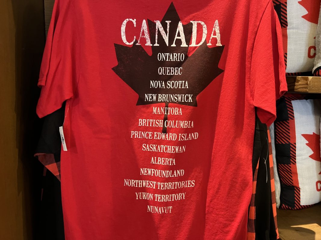 The back of this red T-shirt lists various provinces and territories of Canada over a dark maple leaf silhouette.