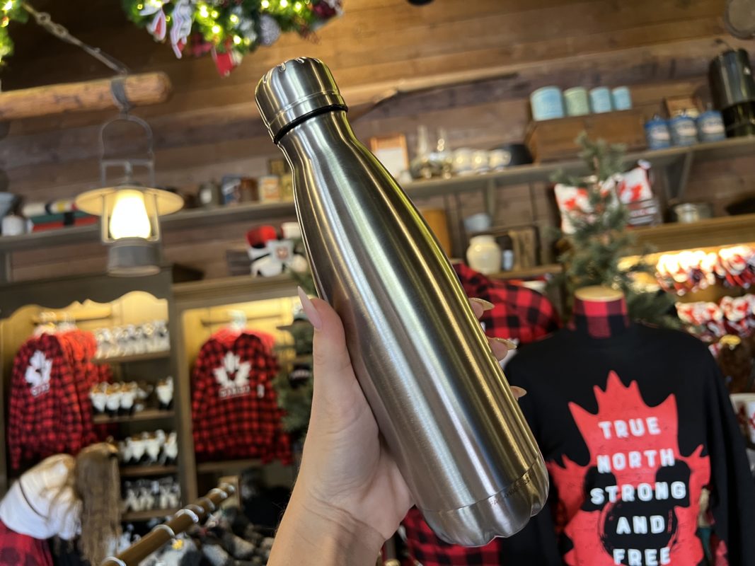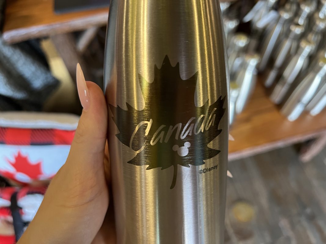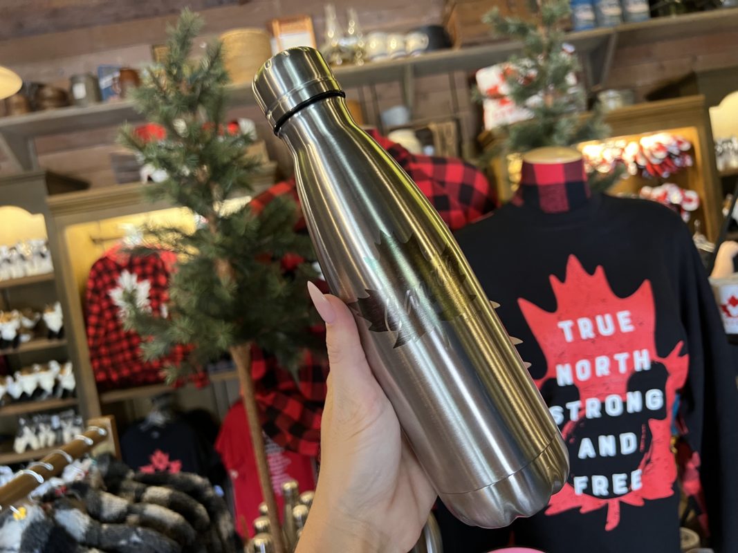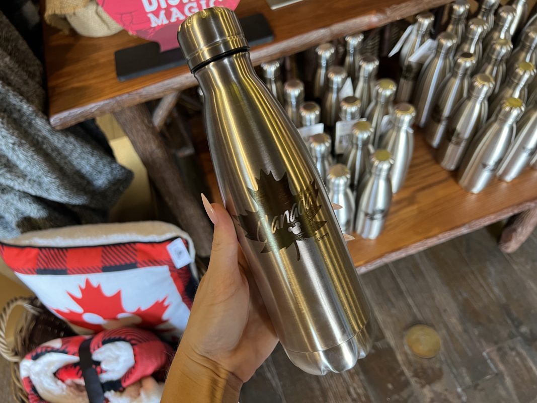 This stainless steel bottle has a maple leaf and “Canada” printed on one side.