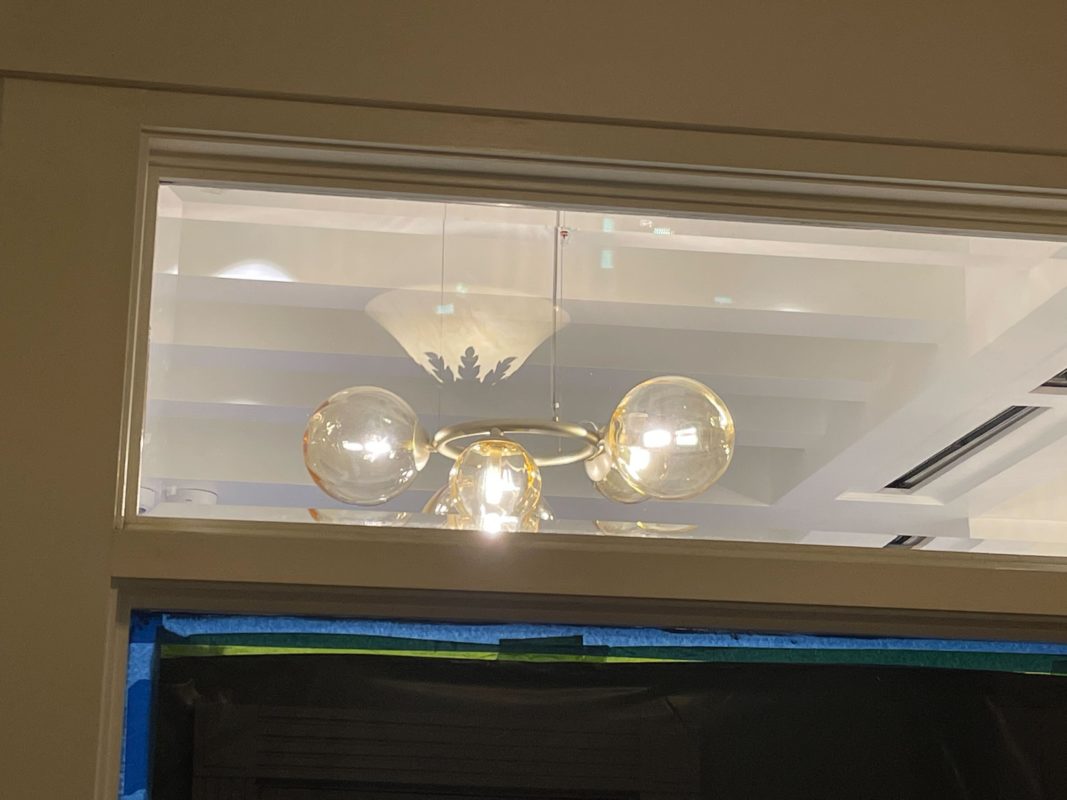 The fixture is suspended from the ceiling. Clear round bulbs encircle the base.