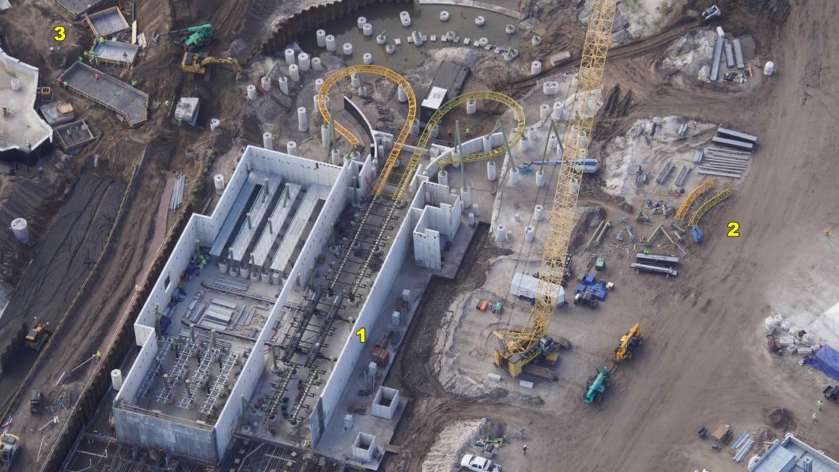 Bioreconstruct has also labeled the transfer bed between the attraction and service building (1), track waiting to be placed (2), and the foundations of the separate but nearby “How To Train Your Dragon” coaster (3).