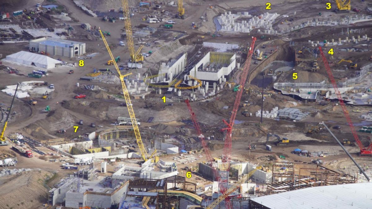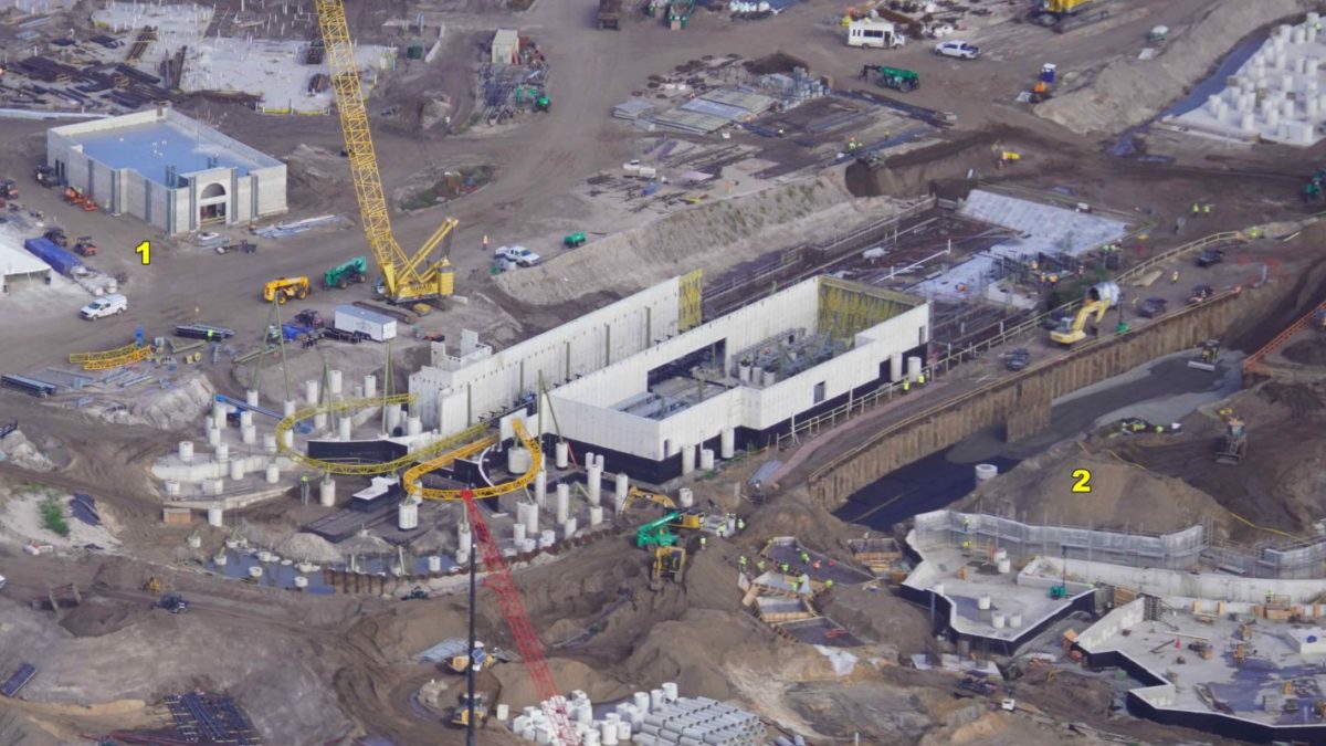 The number 1 in the above photo is a building outside of what will be the third Wizarding World of Harry Potter land. On the other side of the dual-racing coaster, the number 2 is the excavated land for the “How To Train Your Dragon” coaster.
