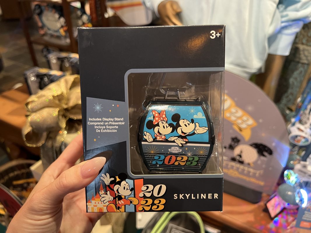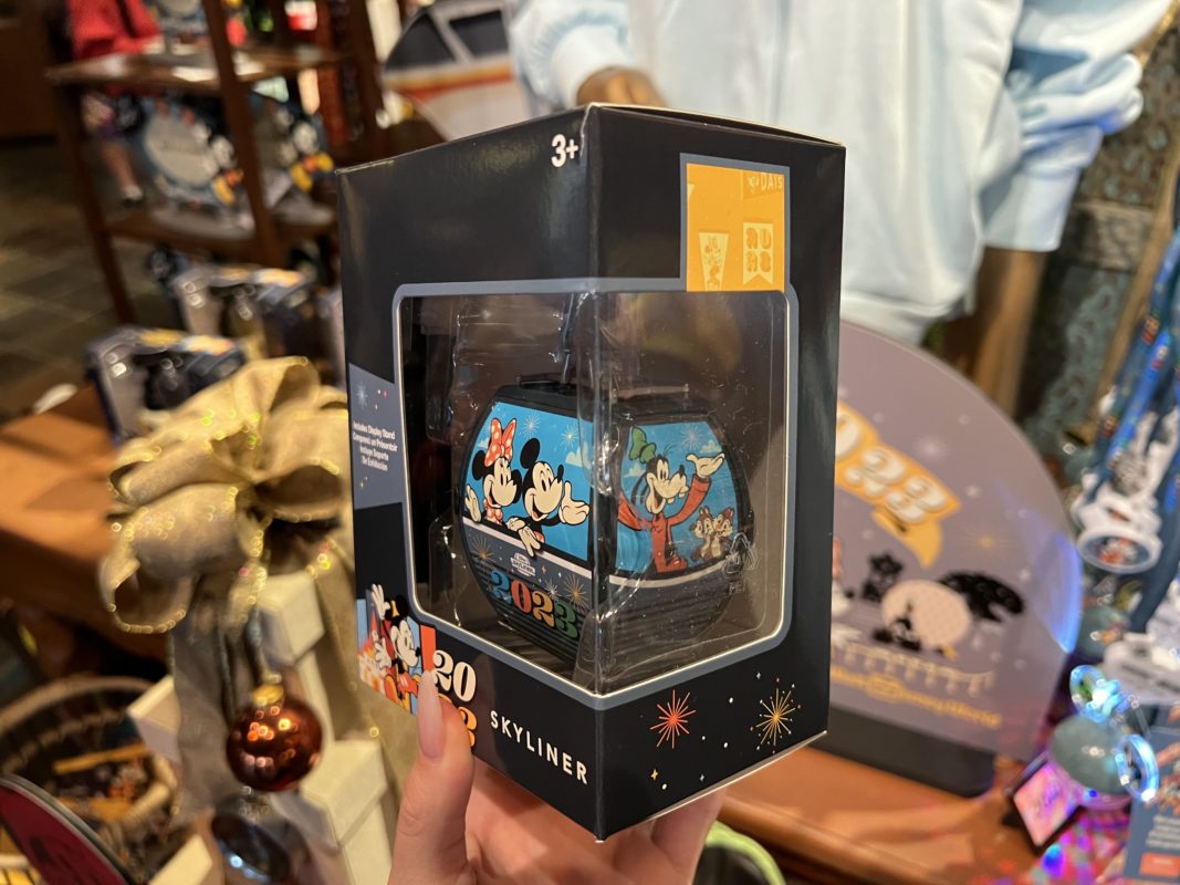 A model Disney Skyliner has hit the shelves of Discovery Trading Company in Disney Animal Kingdom as part of the Disney Parks Dated 2023 Collection. This Skyliner features some pretty recognizable passengers, including Mickey and Minnie on one side and Goofy and Chip ‘n Dale on another. The Disney Skyliner branding is shown just above the signature “2023” on the front of the Skyliner. A display stand ensures the Skyliner stays suspended for all to see.