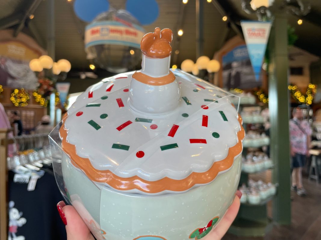 A Mickey snowman acts as the handle of the lid, which resembles a cookie itself covered in red and green sprinkles.