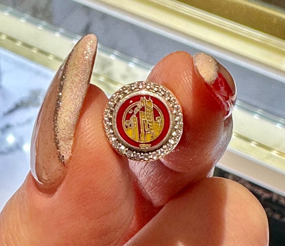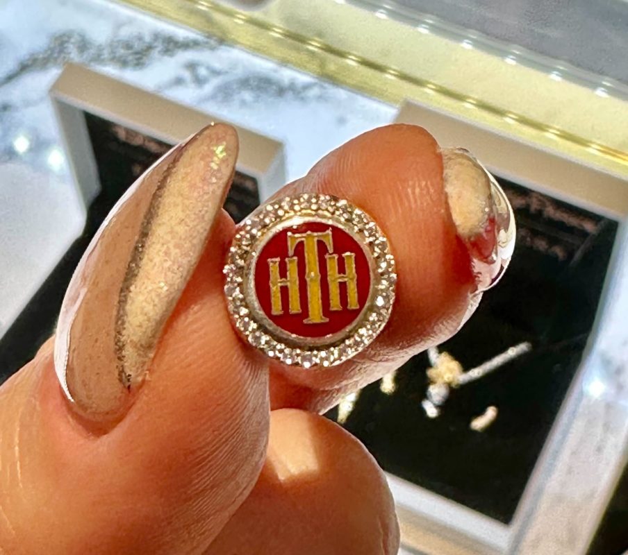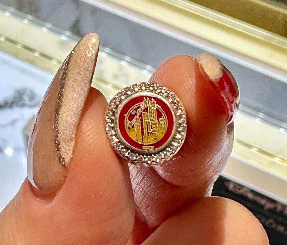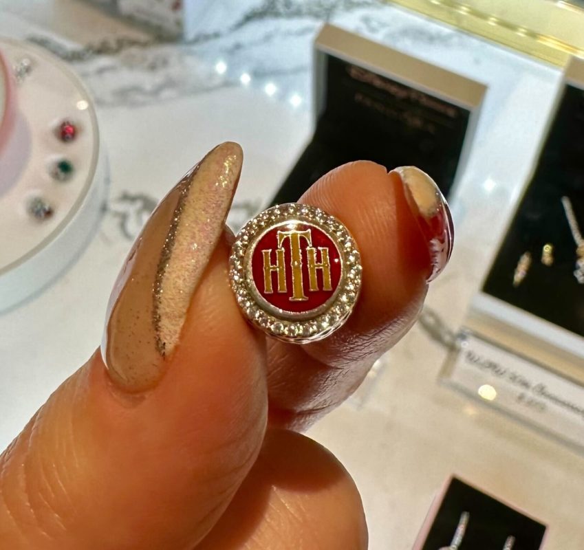On the backside of the charm is “HTH,” the Hollywood Tower Hotel logo. It too is in a golden yellow color against a red background and framed in decorative silver.