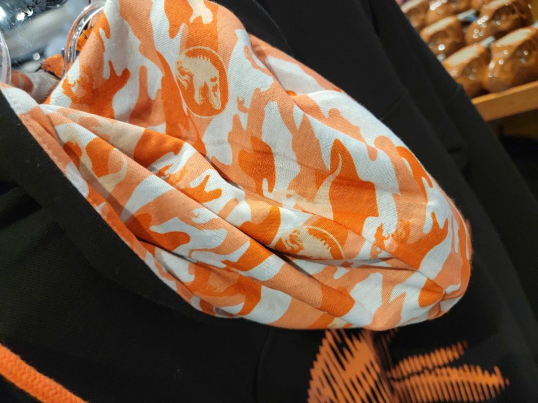 The hood is lined with white and orange camouflage made from the outlines of the “Jurassic Park” franchises’ most beloved creatures and a pattern of the signature Jurassic Park and Jurassic World logosaurus highlighted throughout.