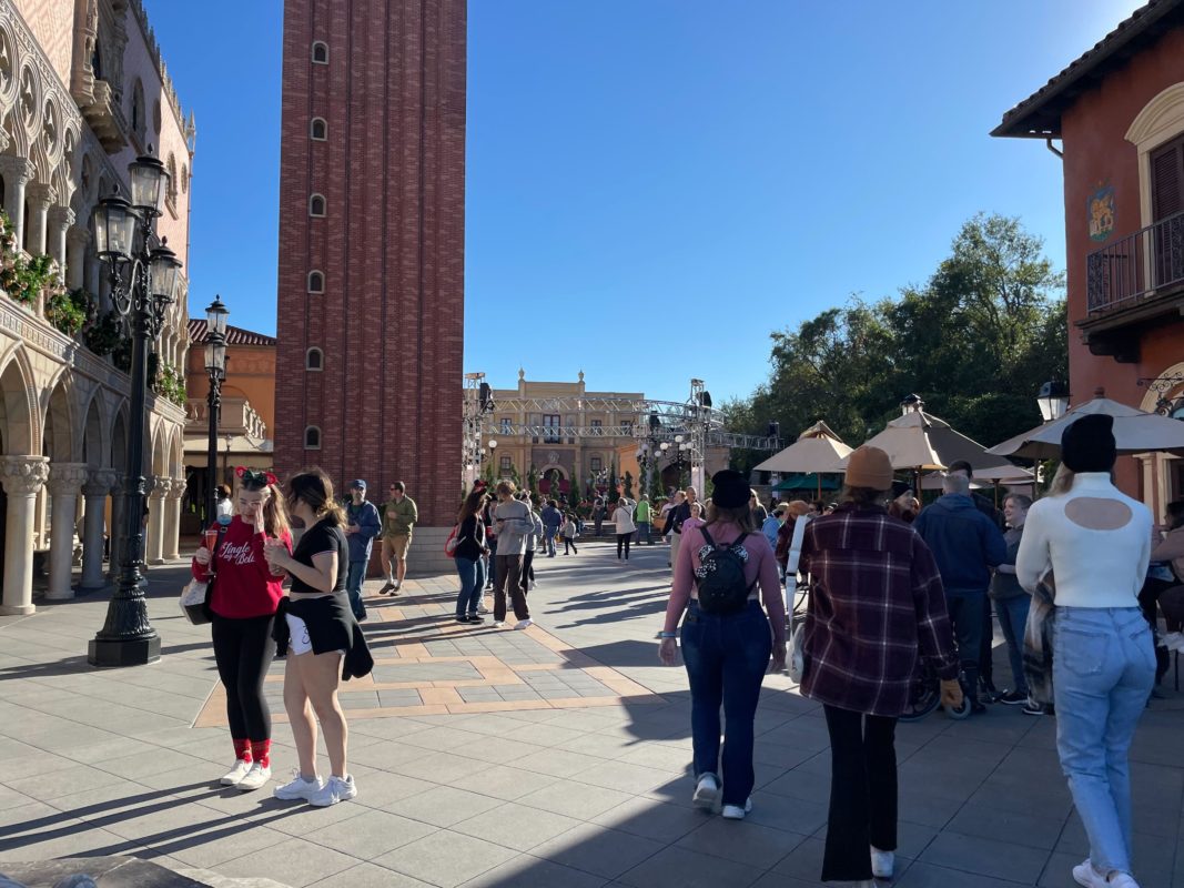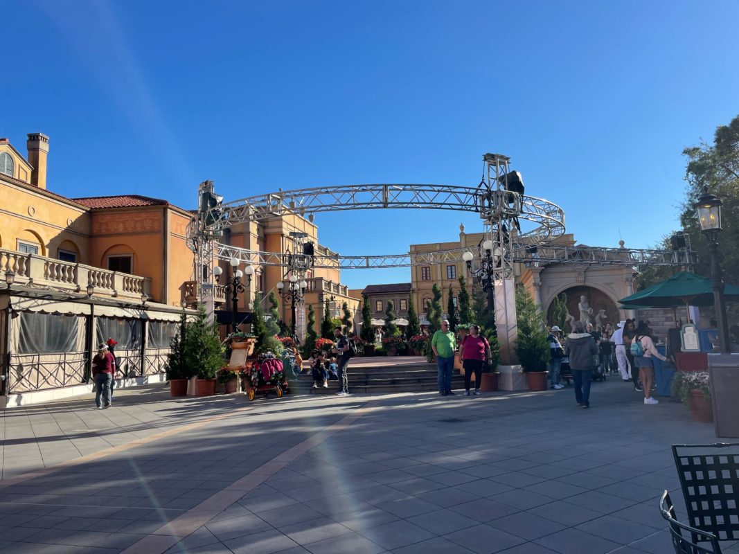 The Italy Pavilion also appears ready to bring in 2023 with live performances this weekend. The structure is set up in the center of the pavilion plaza, with rigging set up for lights and speakers. Scrim has been added to the bottom of the tower’s support beams to hide the steel. Lights have not yet been installed but we expect to see them in the next few days.