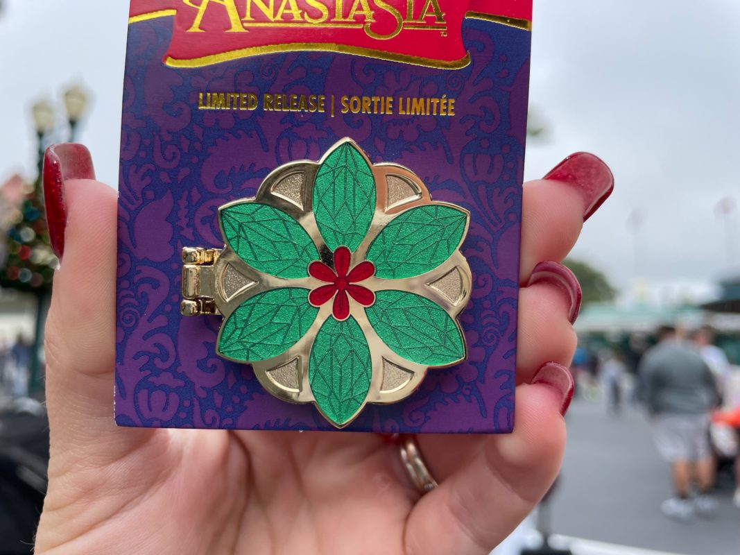 This pin looks almost equivalent to the pendant necklace Anastasia’s grandmother gave her in the featured film. The flower depicted on the front of the pin is a Russian lotus.